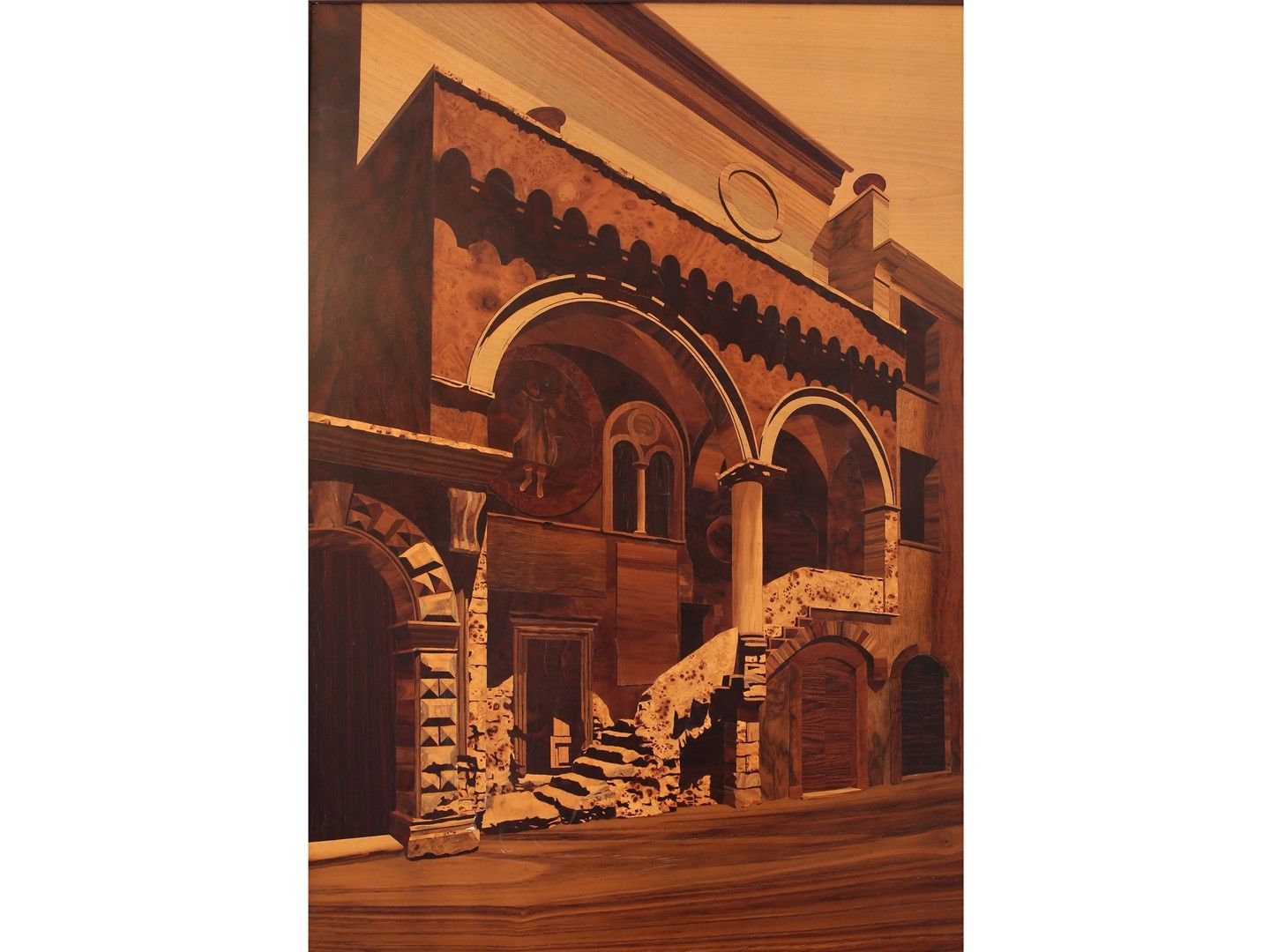 1936-2017 pannello intarsiato in varie essenze, firmato, in cornice, alcuni difetti