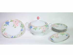 decorato con motivi a fiori, foglie e tralci d'uva nei toni del rosa, del verde e del blu, composto da diciotto [..]