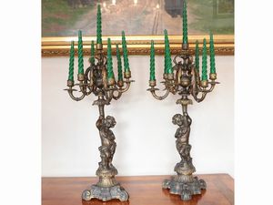 h cm 67 sette bracci portacandela realizzati a doppia voluta con motivi a foglie d'acanto riuniti da sfera centrale, [..]