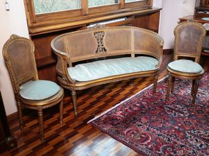 divano lungh cm 130 inizio del XX secolo realizzato in stile neoclassico, intagliato con motivi a torchon e floreali, [..]