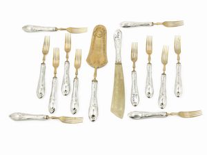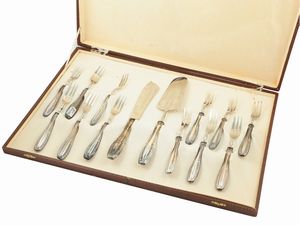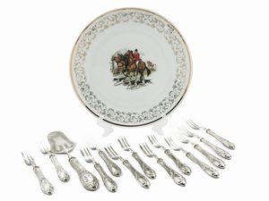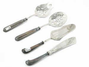 un lume da tavolo, due bracci portacandela e un'alzata con coppa realizzata a grata con tre figure di putti musicanti [..]