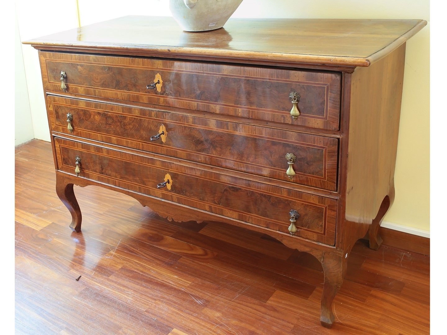 seconda metà del XVIII secolo tre cassetti sul fronte intarsiati con filettature in legni di frutto, piedi mossi, alcuni restauri