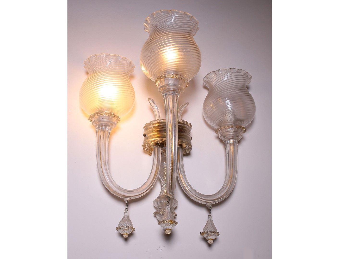 cm 50x40 Murano, Anni Cinquanta realizzate in vetro incolore con inclusioni dorate, ciascuna a tre bracci portacandele ricurvi con grandi bobeche a torchon con bordo smerlato e pendenti piriformi, possibili lievi difetti