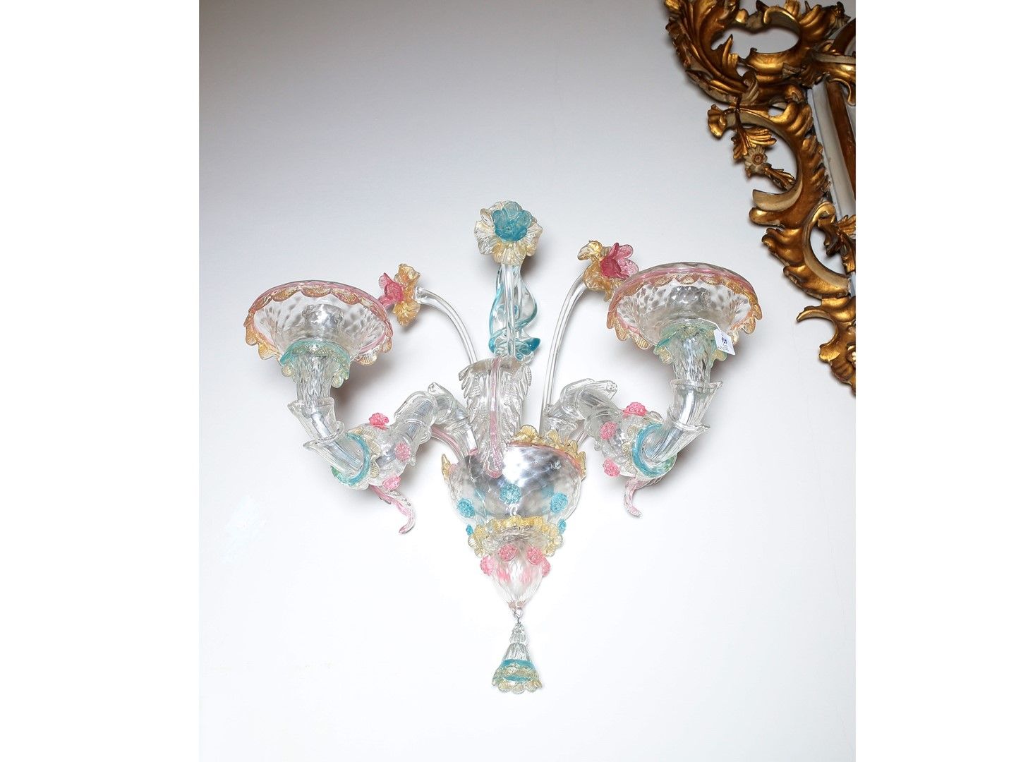 Barovier e Toso, Anni Cinqunata realizzate in vetro incolore e dettagli nei toni pastello, due bracci portacandele a doppia voluta coon trionfo di fiori di giunchiglia, mancanze