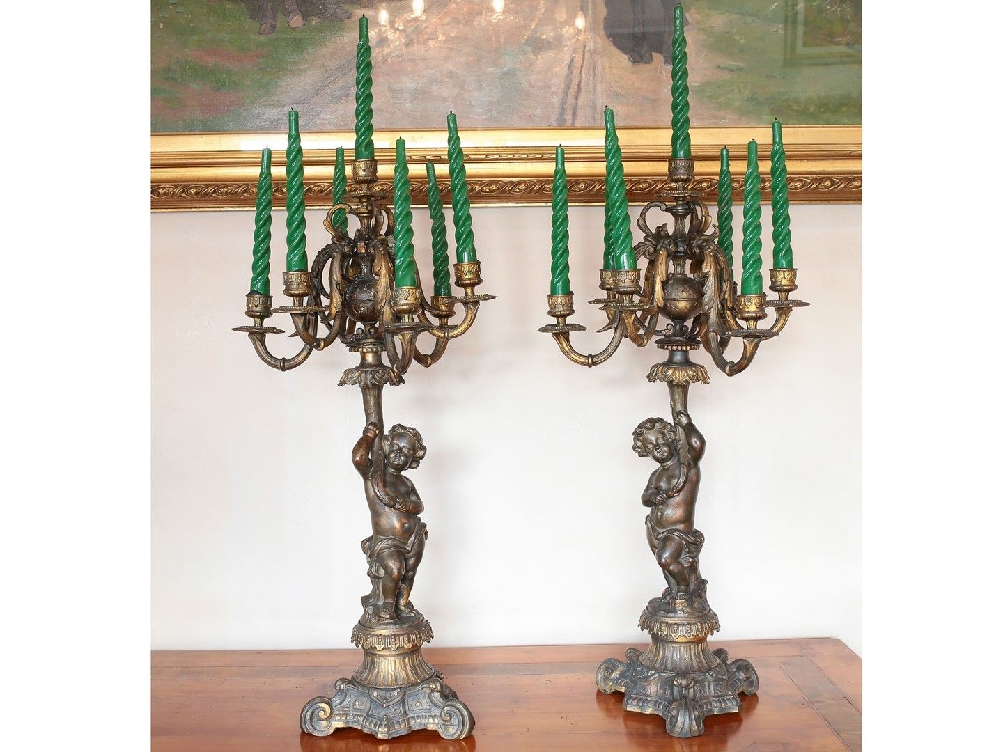 sette bracci portacandela realizzati a doppia voluta con motivi a foglie d'acanto riuniti da sfera centrale, fusto a foggia di putto su base rococ̣ su piedi desinenti a ricciolo