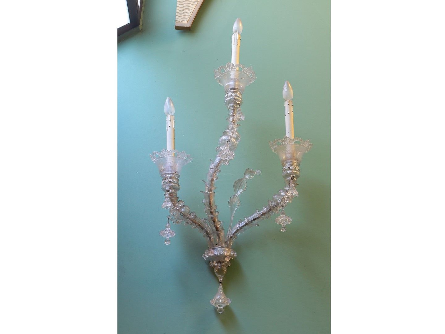 cm 73x50 Murano, prima metà del XX secolo di gusto settecentesco, ciascuno a tre bracci portacandele di forma sinuosa, bobeche a coppa con bordo traforato e pendenti, alcuni difetti e mancanze ma corredati di pezzi di ricambio