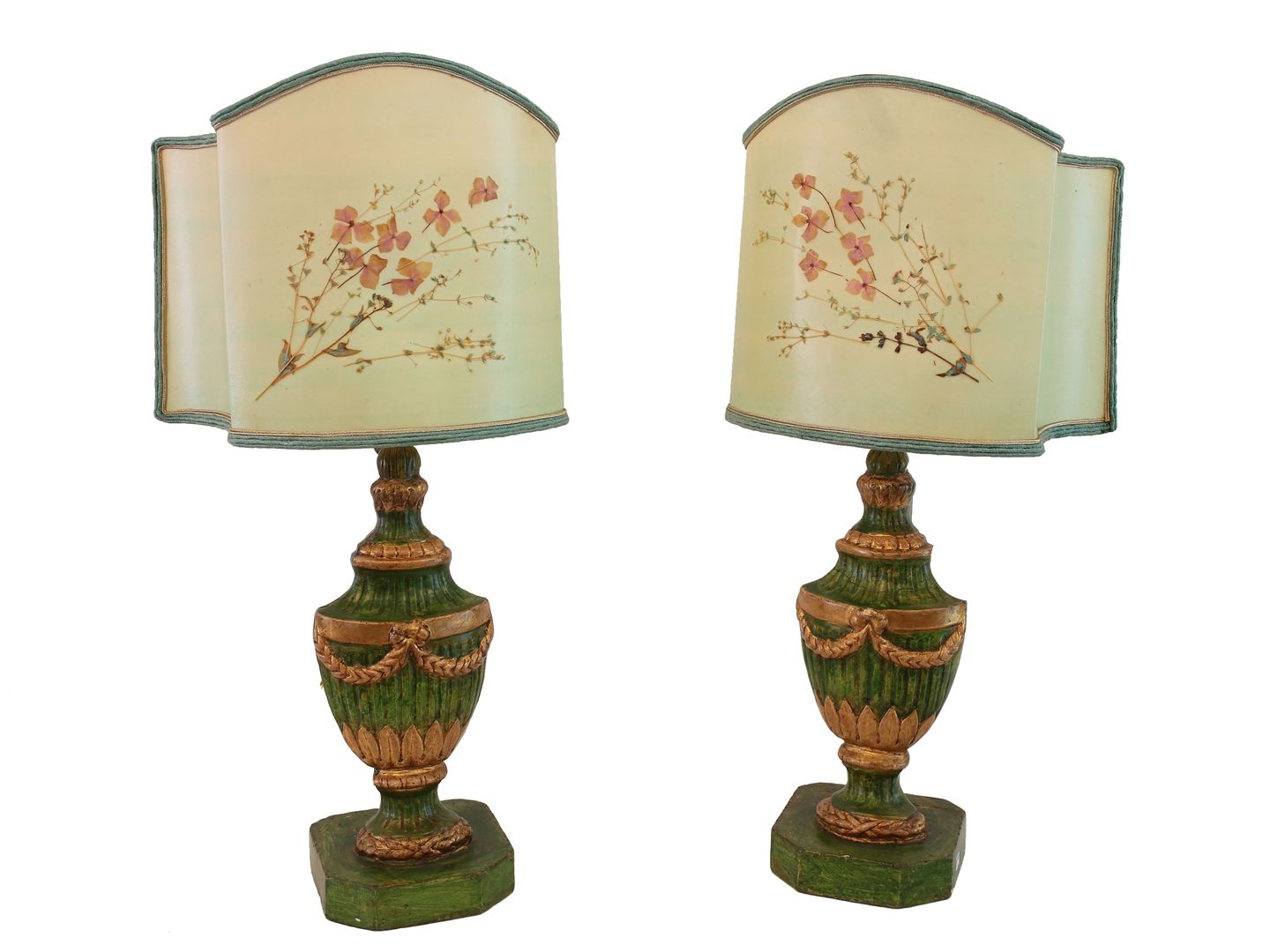 Coppia di lumi da tavolo con basi in legno laccato verde e dorato