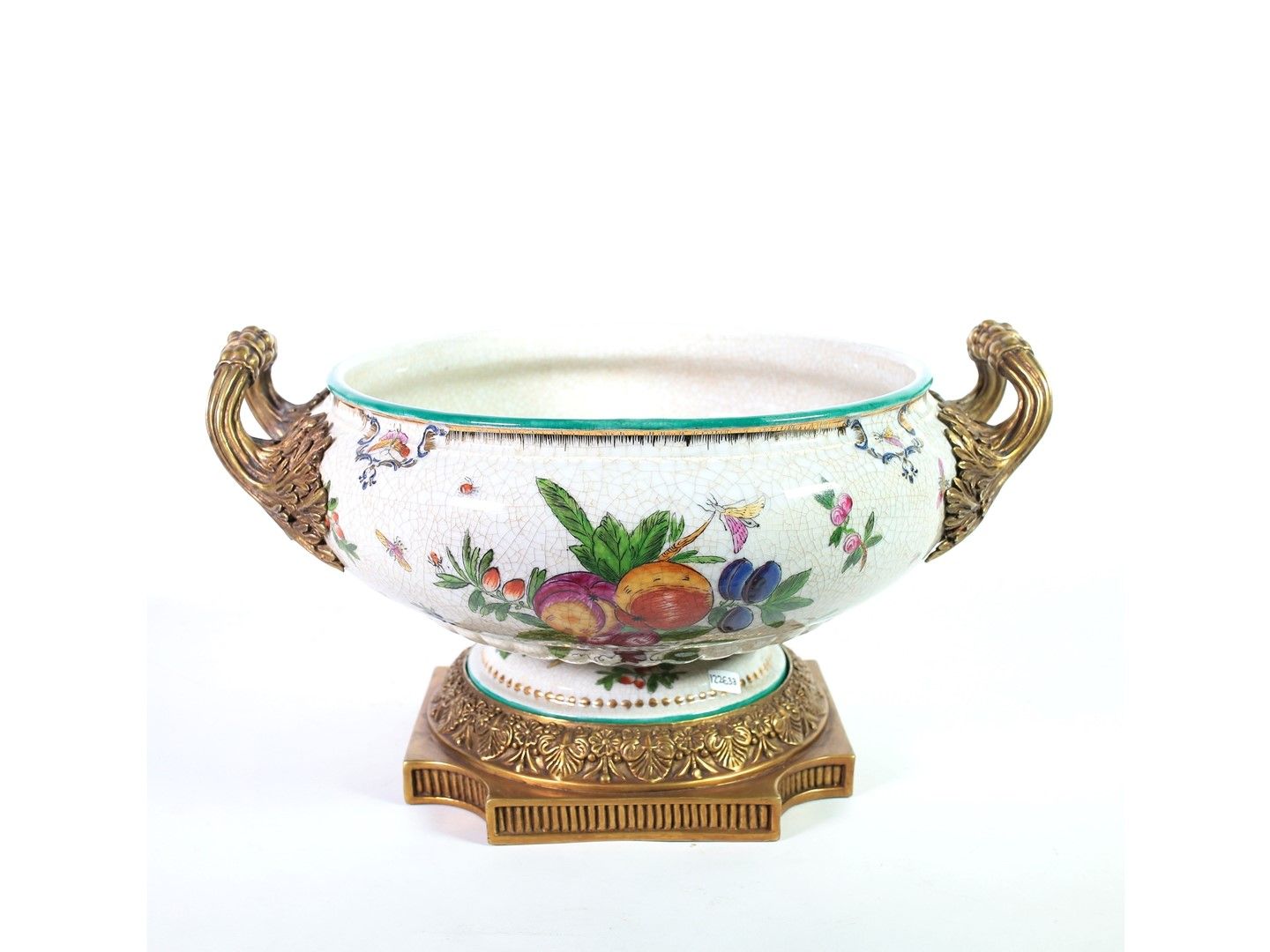 Francia, Manifattura MP realizzata come una coppa decorata a motivi floreali, frutta e farfalle, rilegata in bronzo dorato