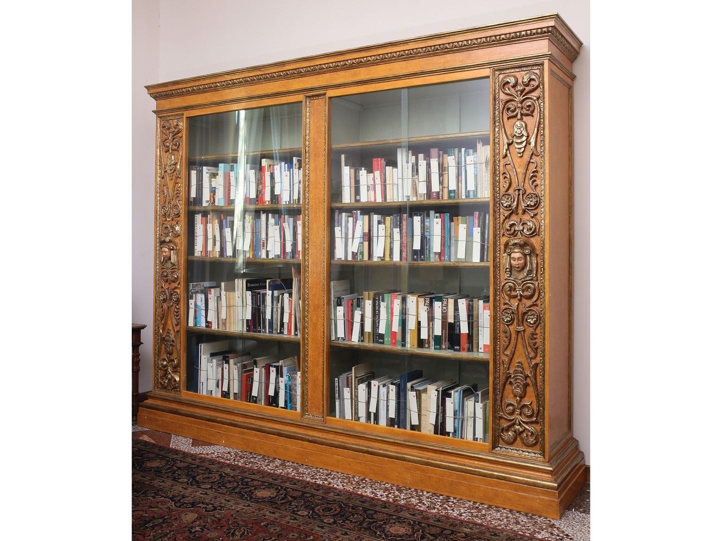 h cm 265x307x60 laccata nei toni dell'ocra con lumeggiature a mecca, realizzata con due antichi frammenti montati a lesene, intagliati con motivi floreali e volute centrate da mascheroni ad altorilievo, cimasa con gocciolatoio a palmette, divisa in due parti ciascuna con cinque ripiani, due ante scorrevoli in cristallo, interni laccati verde salvia, base modanata a cornice, lievi difetti