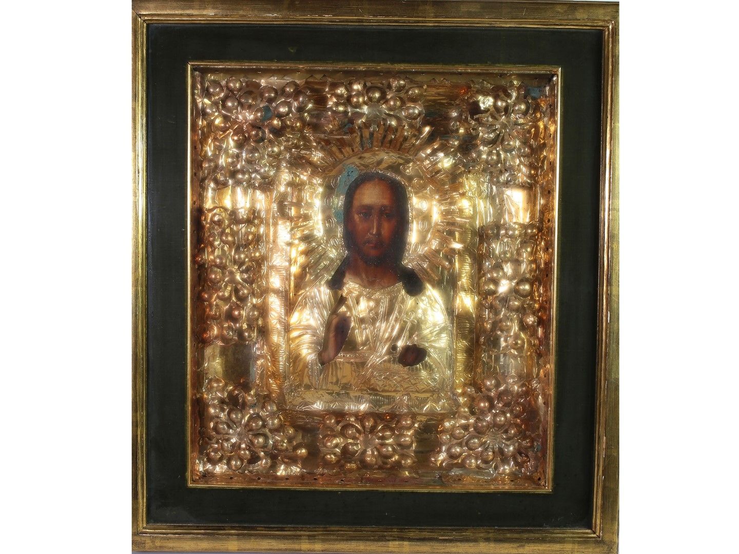 Scuola russa della fine del XIX secolo dipinta ad olio su tavola con Cristo, ritza interamente realizzata in tôle dorata lavorata a formare una controcornice a trionfo di volute, entro cornice a teca, lievi difetti