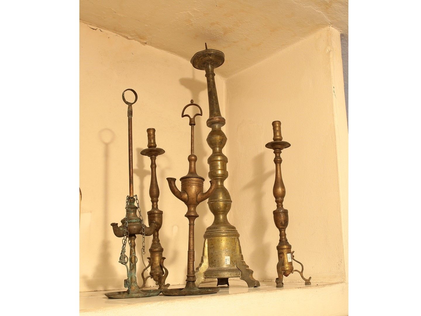 composto da due lucerne fiorentine di diversa foggia, una coppia di candelabri e una grande torciera, lievi difetti (5)