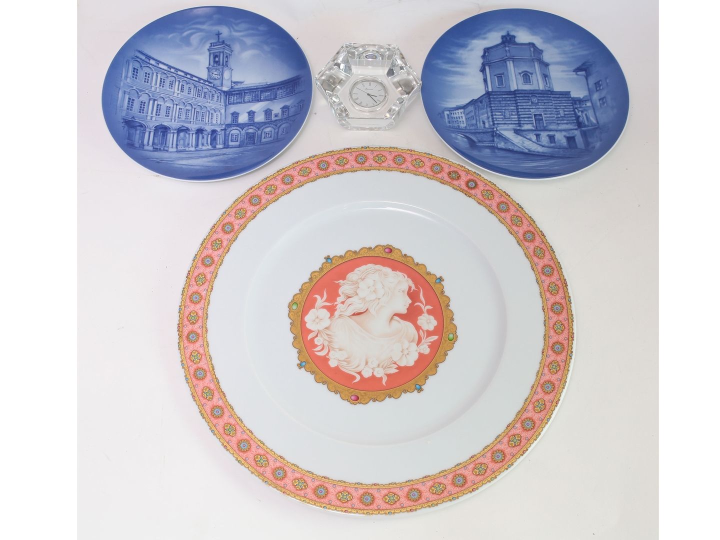 composto da un piatto in porcellana Ugo Poggi per Banca Toscana, decorato con figura femminile, entro scatola originale, due piatti in porcellana Rosenthal, decorati con vedute del santuario di Monte Senario e la chiesa di Santa Caterina, entro scatola originale, e un orologio da tavolo di forma esagonale in cristallo Baccarat (4)