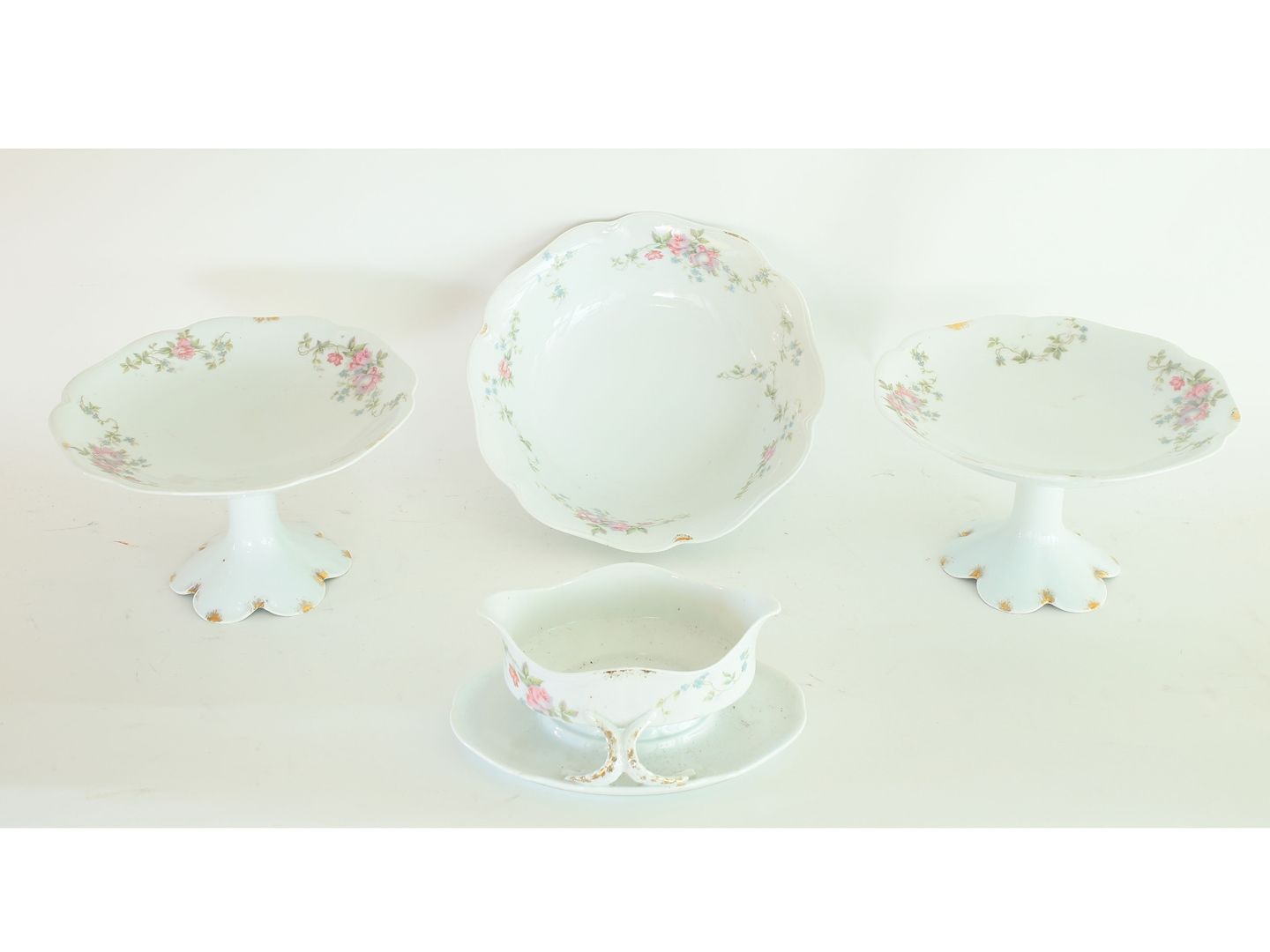 inizio del XX secolo composto da due alzate, due raviere, un vassoio rotondo, uno ovale, una ciotola e una salsiera decorati a motivi floreali nei toni del rosa, del verde e del celeste con lumeggiature oro, lievi difetti (8)