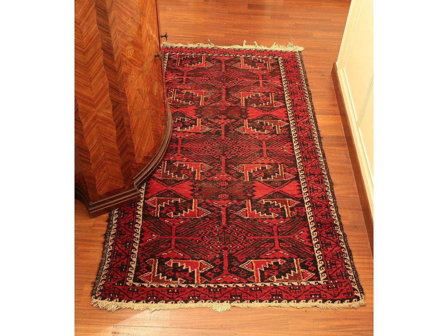 realizzato a motivi geometrici nei toni dell'avorio e del viola scuro a su fondo rosso, lievi difetti