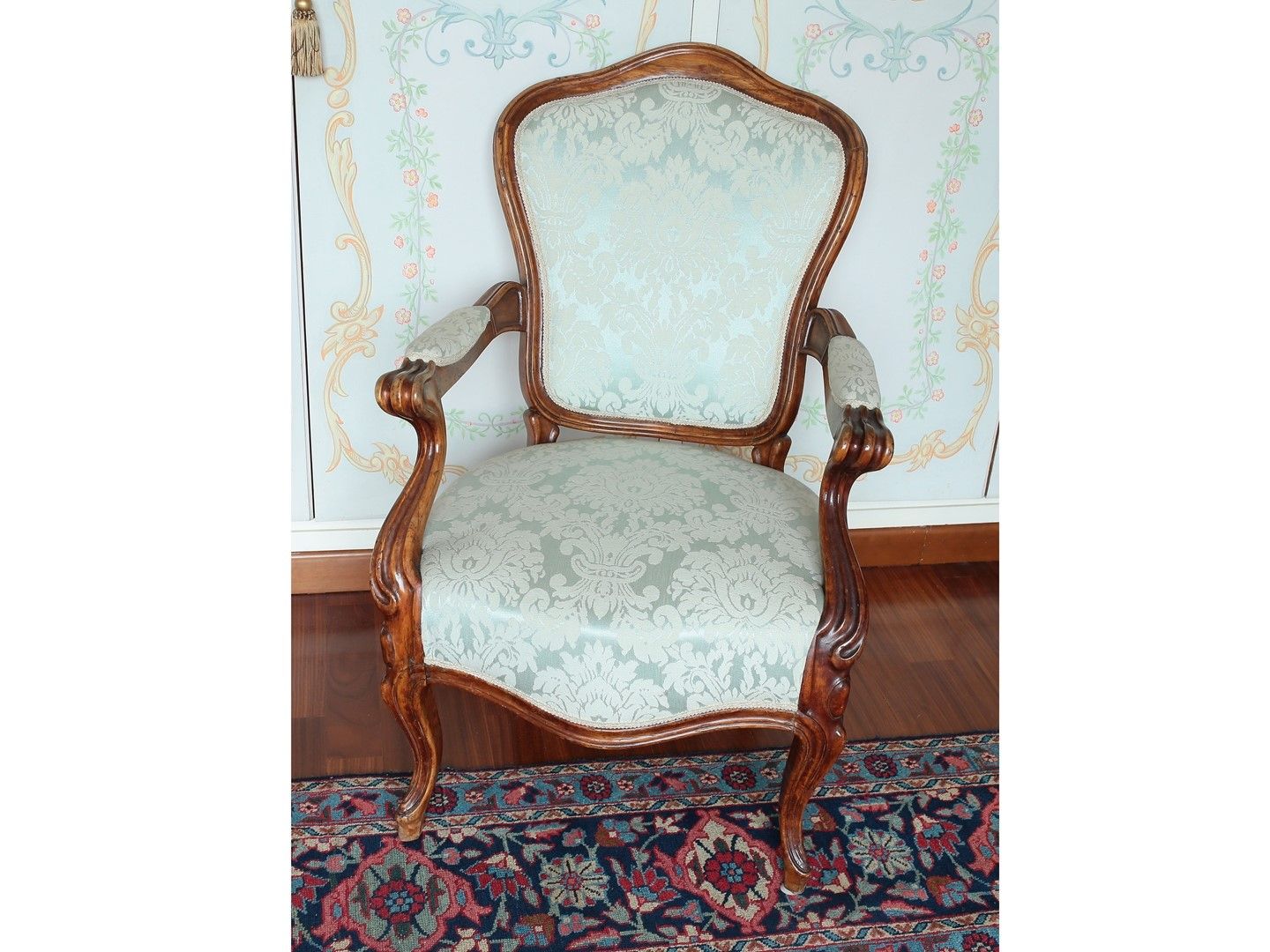 schienale e seduta imbottiti e foderati in tessuto damascato color verde acqua, braccioli e gambe anteriori mosse intagliate a scanalature