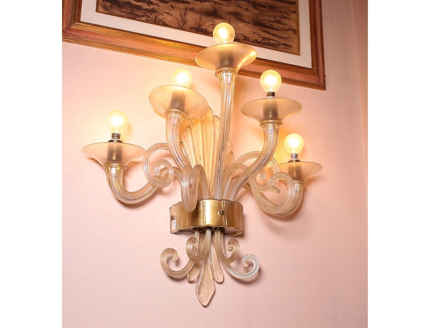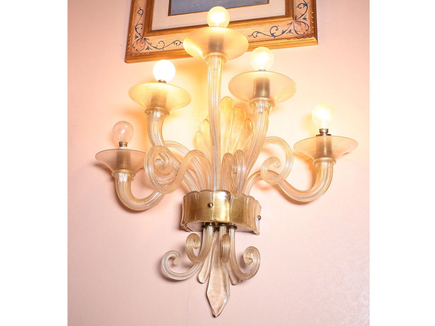 h cm 52x50 Anni Cinquanta realizzate in vetro incolore con inclusioni dorate come un grande bouquet di cinque bracci portacandele di varie mosse alternati a riccioli scanalati, racchiuso da anello dentellato, fondo modellato come una palmetta, possibili lievi difetti