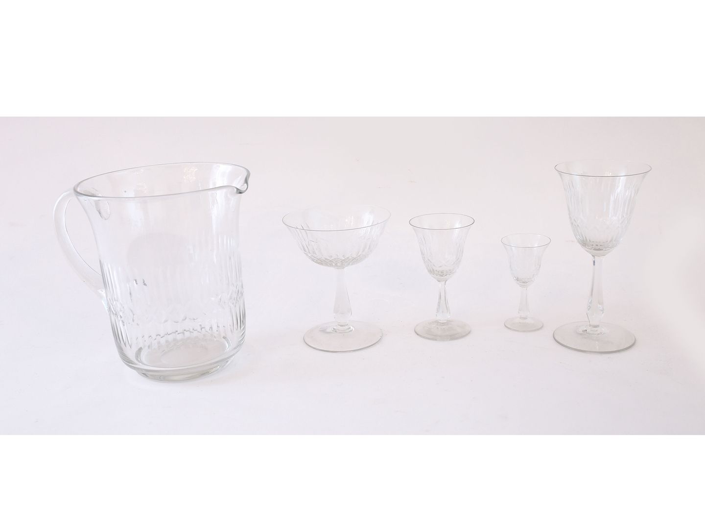 composto da 10 calici da acqua, 10 calici da vino, 10 coppe da spumante, 8 calici da vino dolce, 10 da liquore, due brocche, lievi difetti (50)