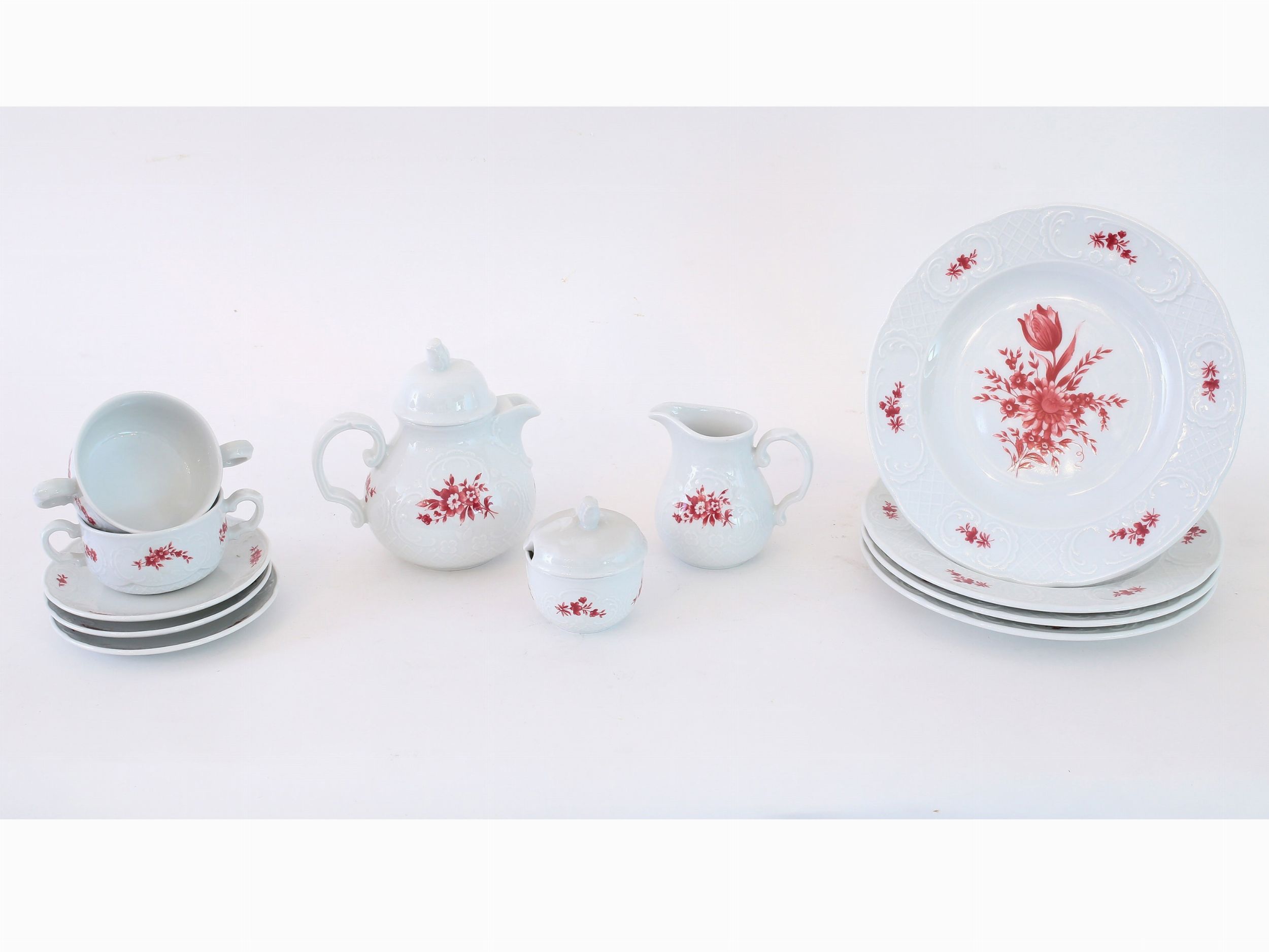 realizzato a motivi floreali in monocromia porpora, composto da dodici sottopiatti, trentadue piatti piani, sedici fondi, trenta piatti da frutta, ventidue piattini da pane, tre vassoi di forma ovale grandi, tre medi, sei piccoli, quattro raviere, otto insalatiere, dodici tazze da consommè con piattino, dodici sale e pepe, dodici tazzine da caffè con piattino, dodici tazze da te con piattino, due lattiere grandi, due piccole, una teiera, una zuccheriera, tre cremiere grandi e due piccole, quattro posacenere, inusato (188)