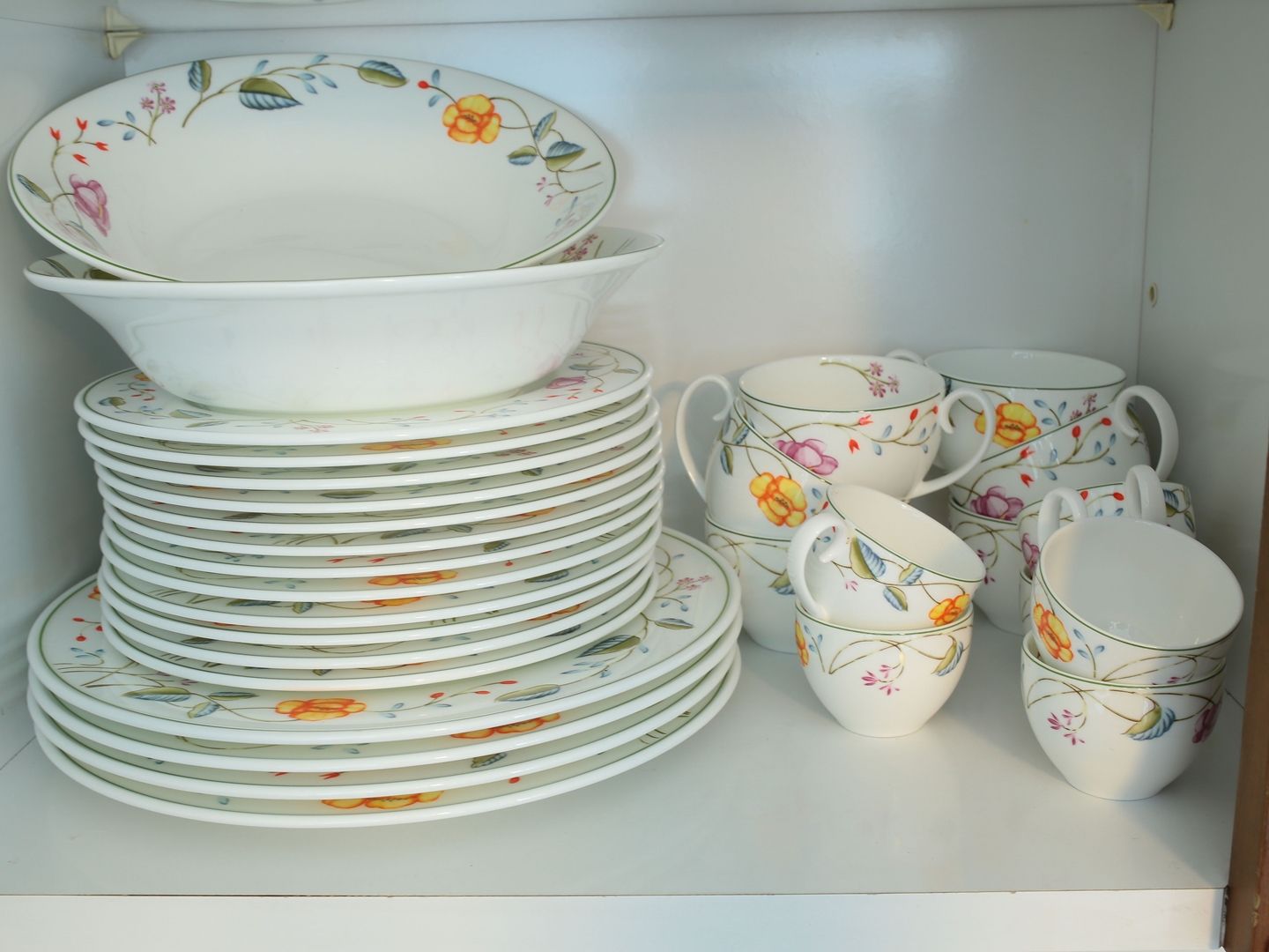 tesa decorata a motivi floreali nei toni del rosa, arancio, verde e celeste, composto da quarantotto piatti, otto vassoi di forma ovale di misura a scalare, quattro vassoi di forma rotonda, due ciotole, sei tazze da tè, sei tazzine da caffè (74)