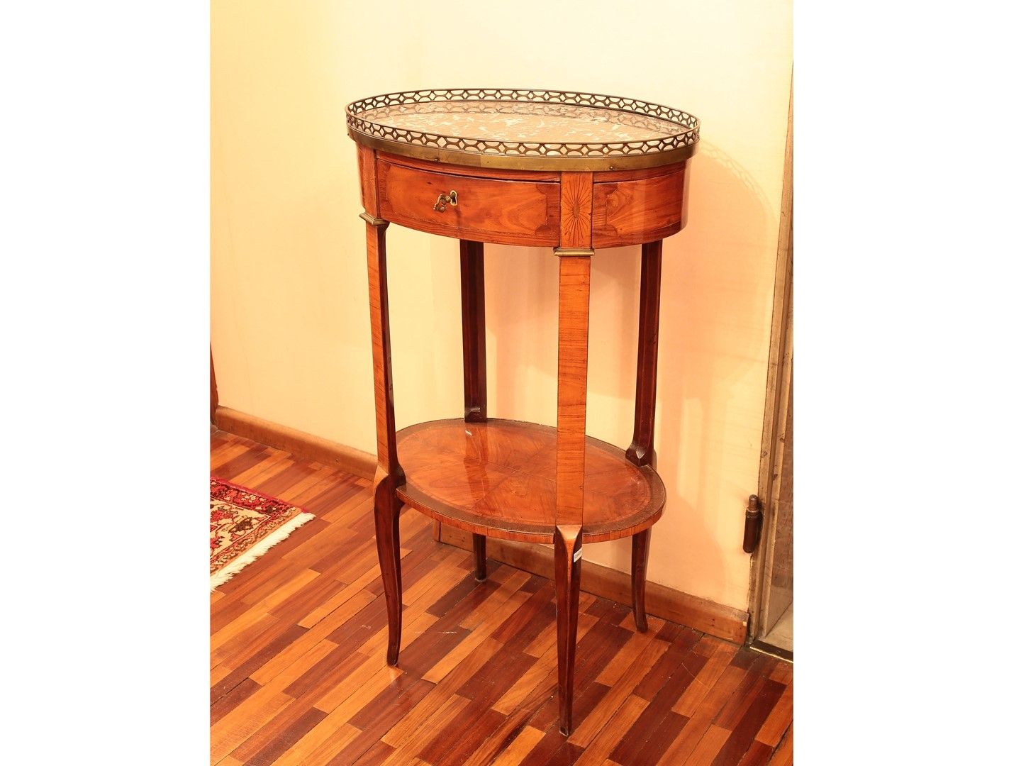 h cm 90,5x51x36 prima metà del del XX secolo piano ovale in marmo con bordo a ringhiera in metallo, intarsiato con filettature e rosoni, un cassetto nella fascia, quattro gambe dritte con finale mosso riunite da ripiano