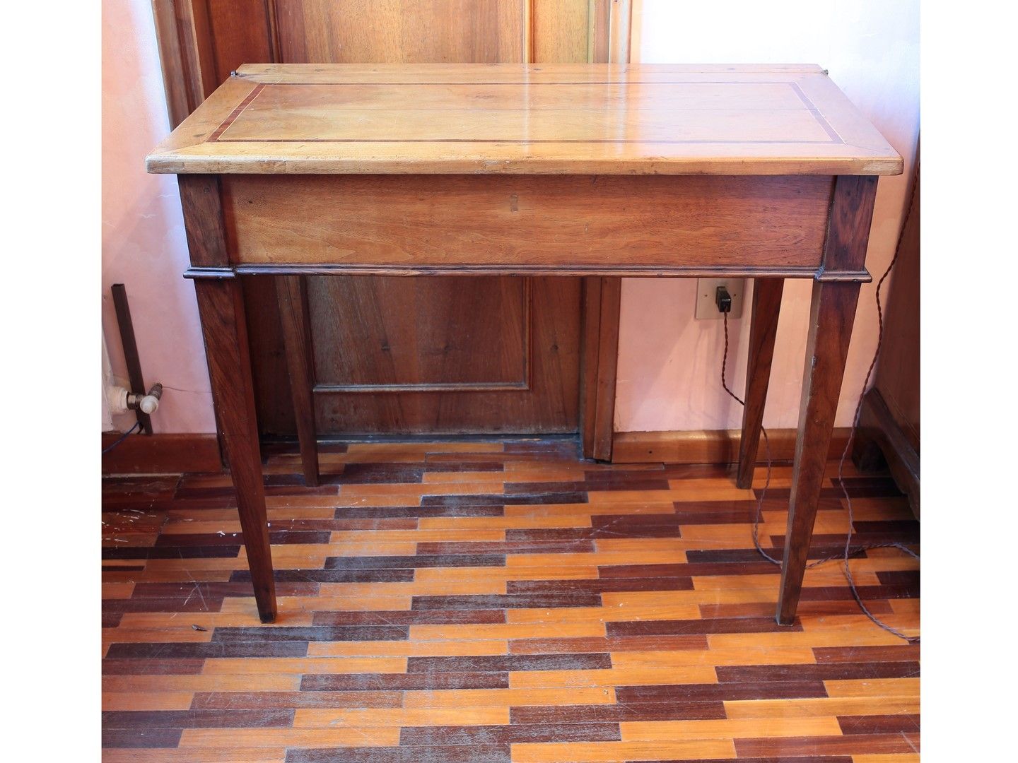 inizio del XIX secolo piano intarsiato con filettature, da alzarsi a celare specchio e vani per accessori, gambe a faretra, lievi difetti
