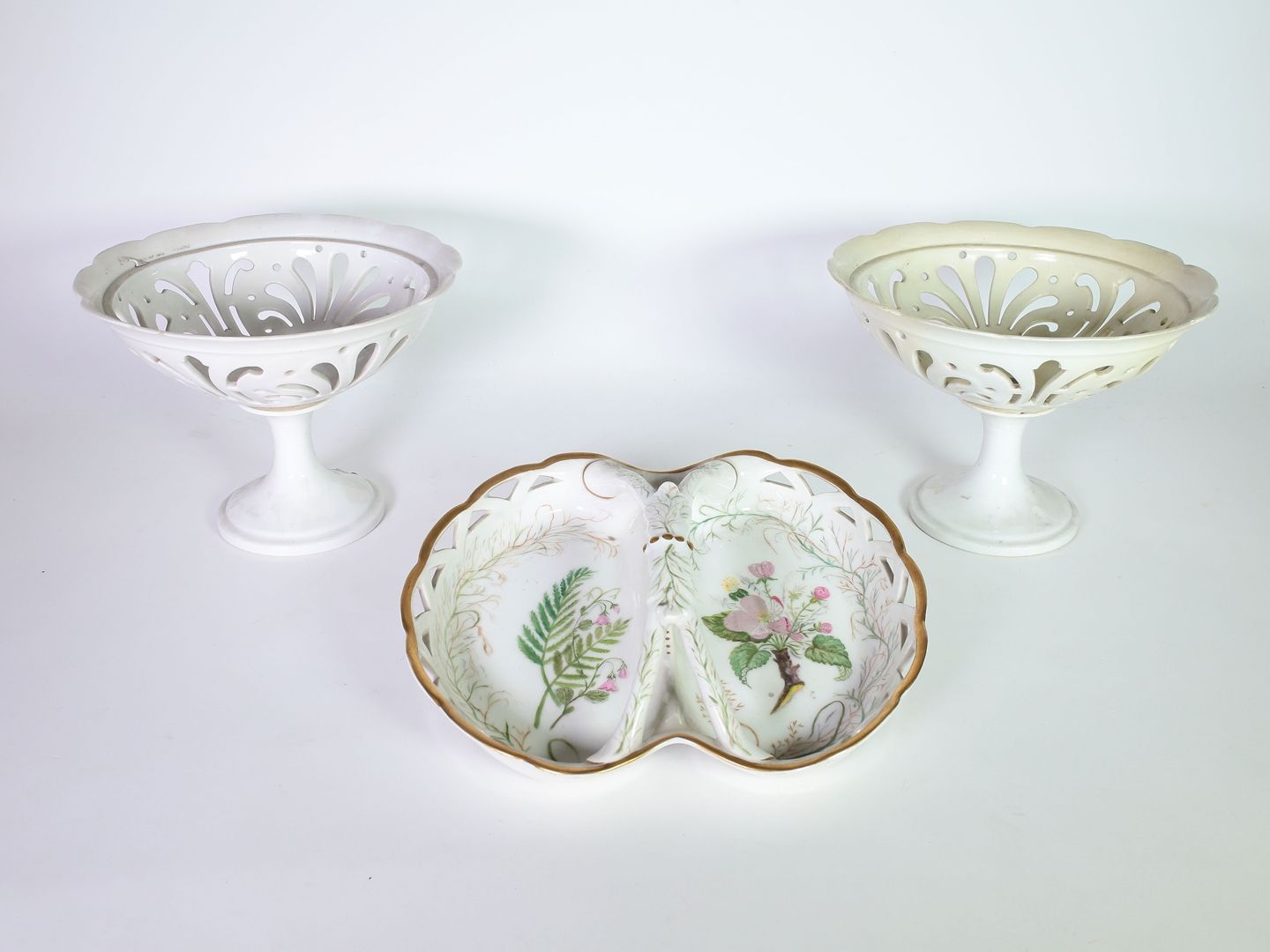 coppia di alzate traforate (una con restauri) e portabon dipinto con motivi floreali