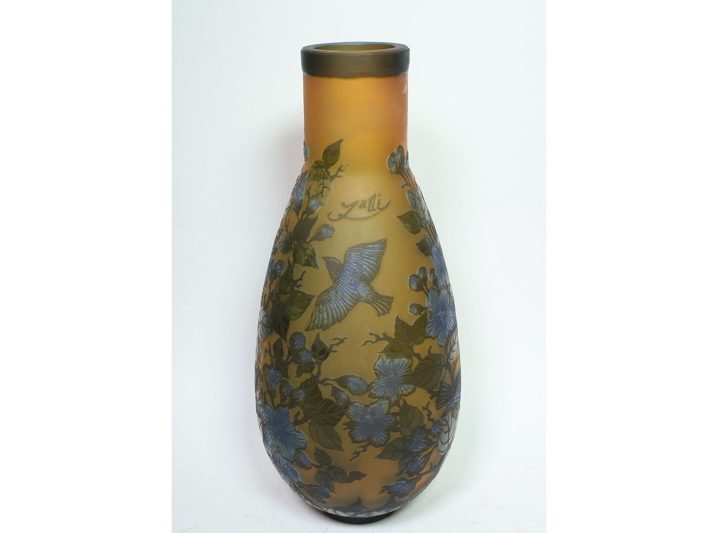 ad imitazione dei Gallé, decorato con motivi a fiori e uccellini su fondo giallo