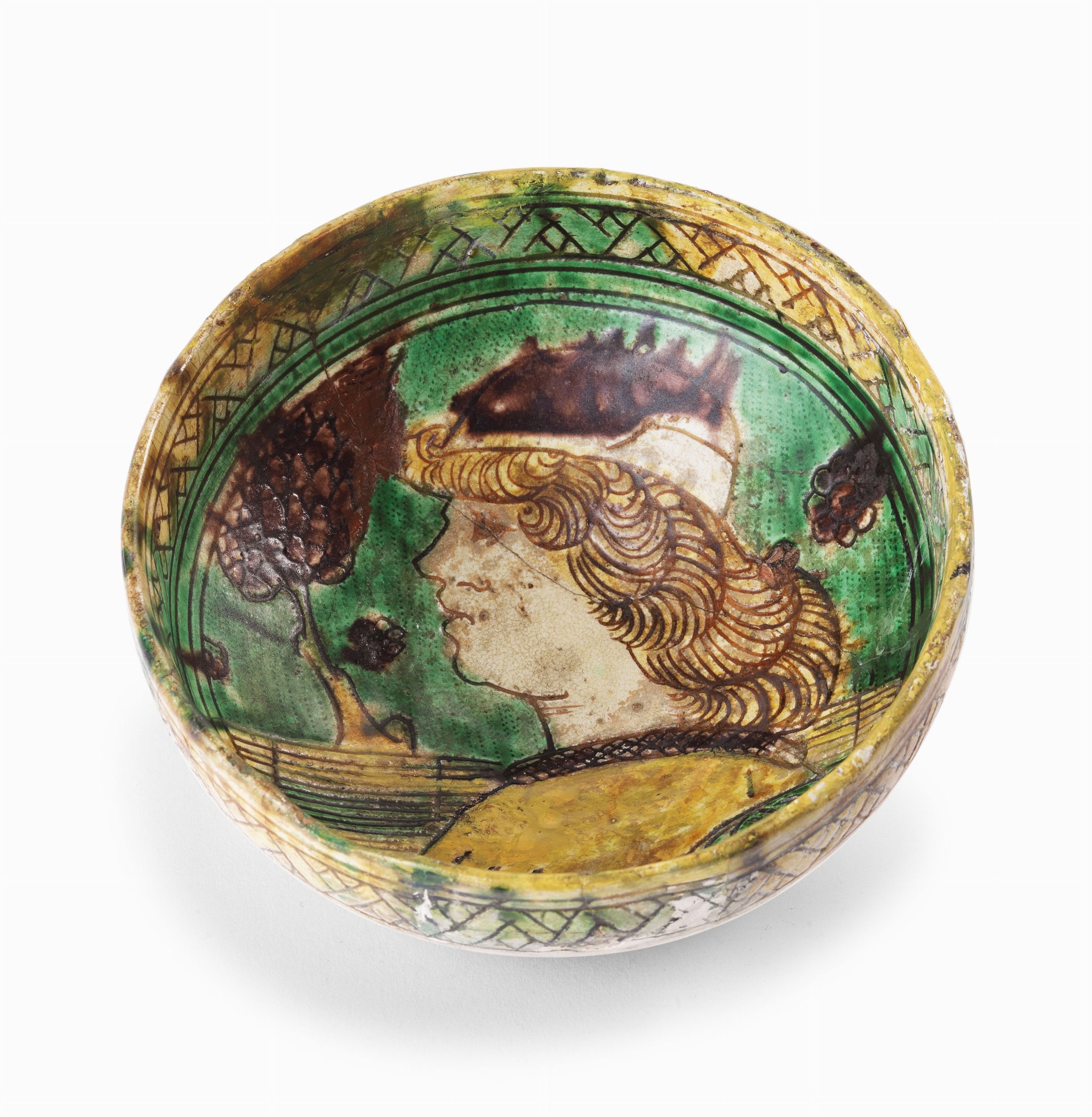 Coppa graffita in maiolica policroma verde rame, manganese e ocra gialla