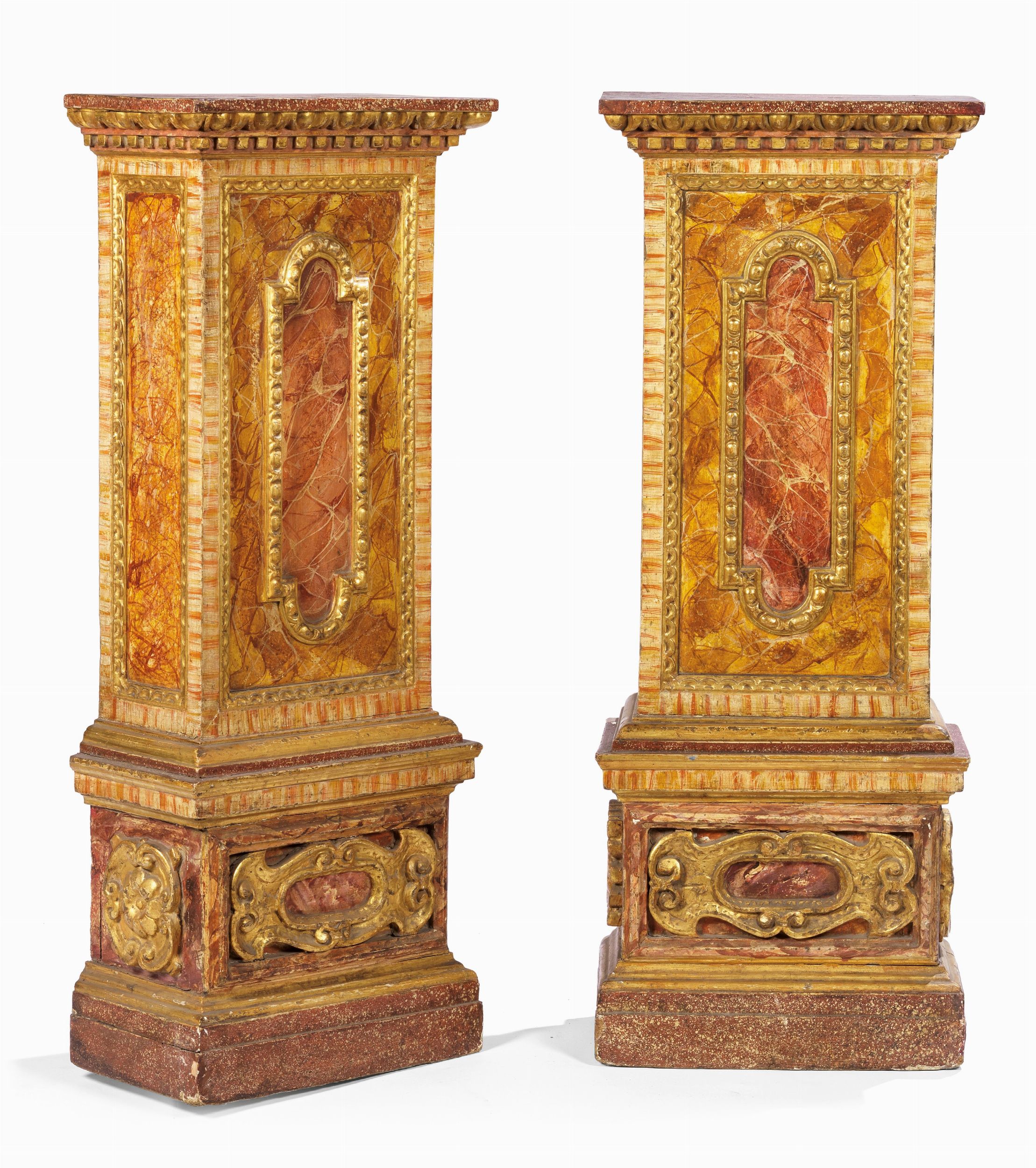 Due basi in legno intagliato, dorato e laccato a finto marmo