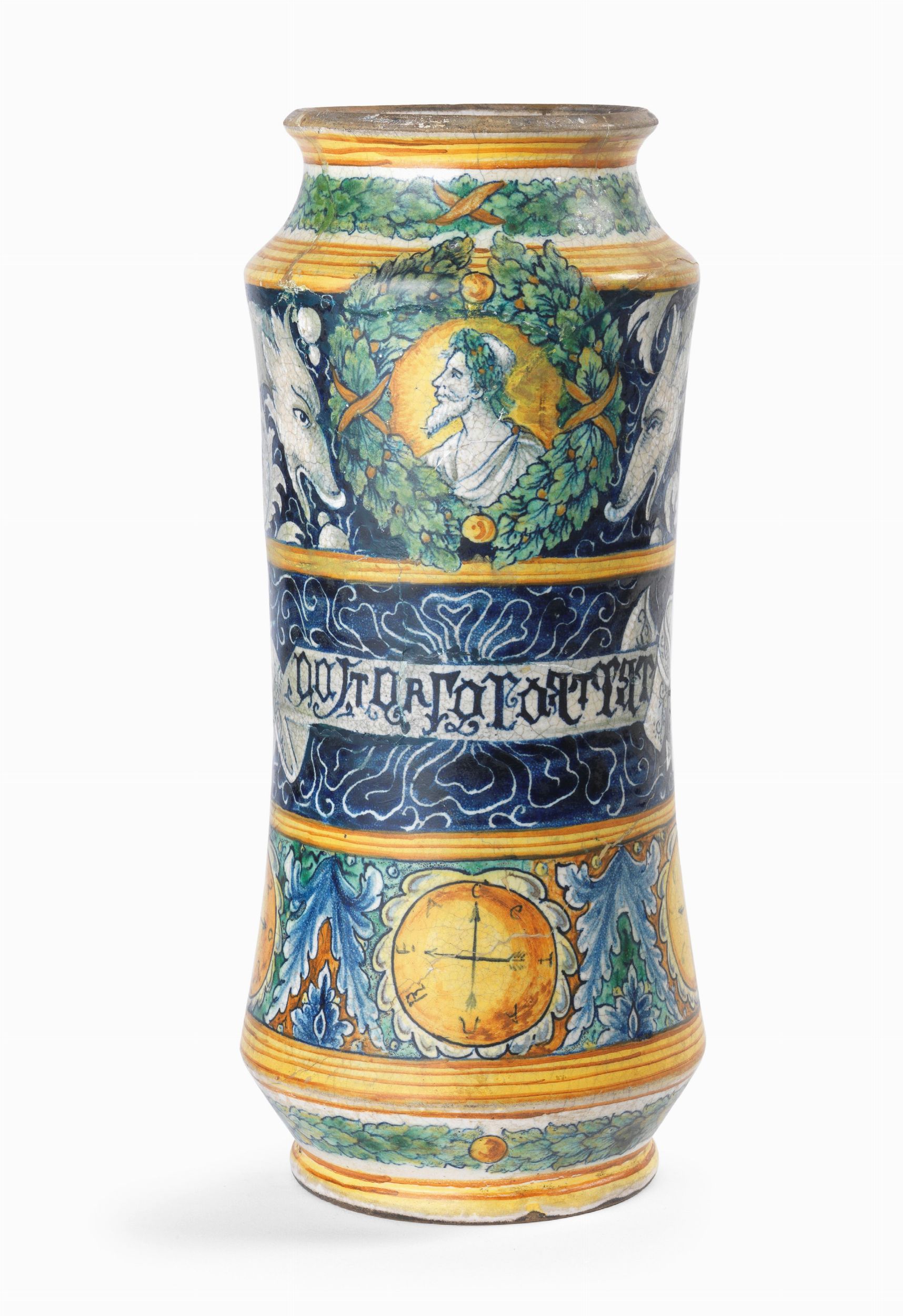Grande albarello in maiolica policroma blu, verde e ocra gialla