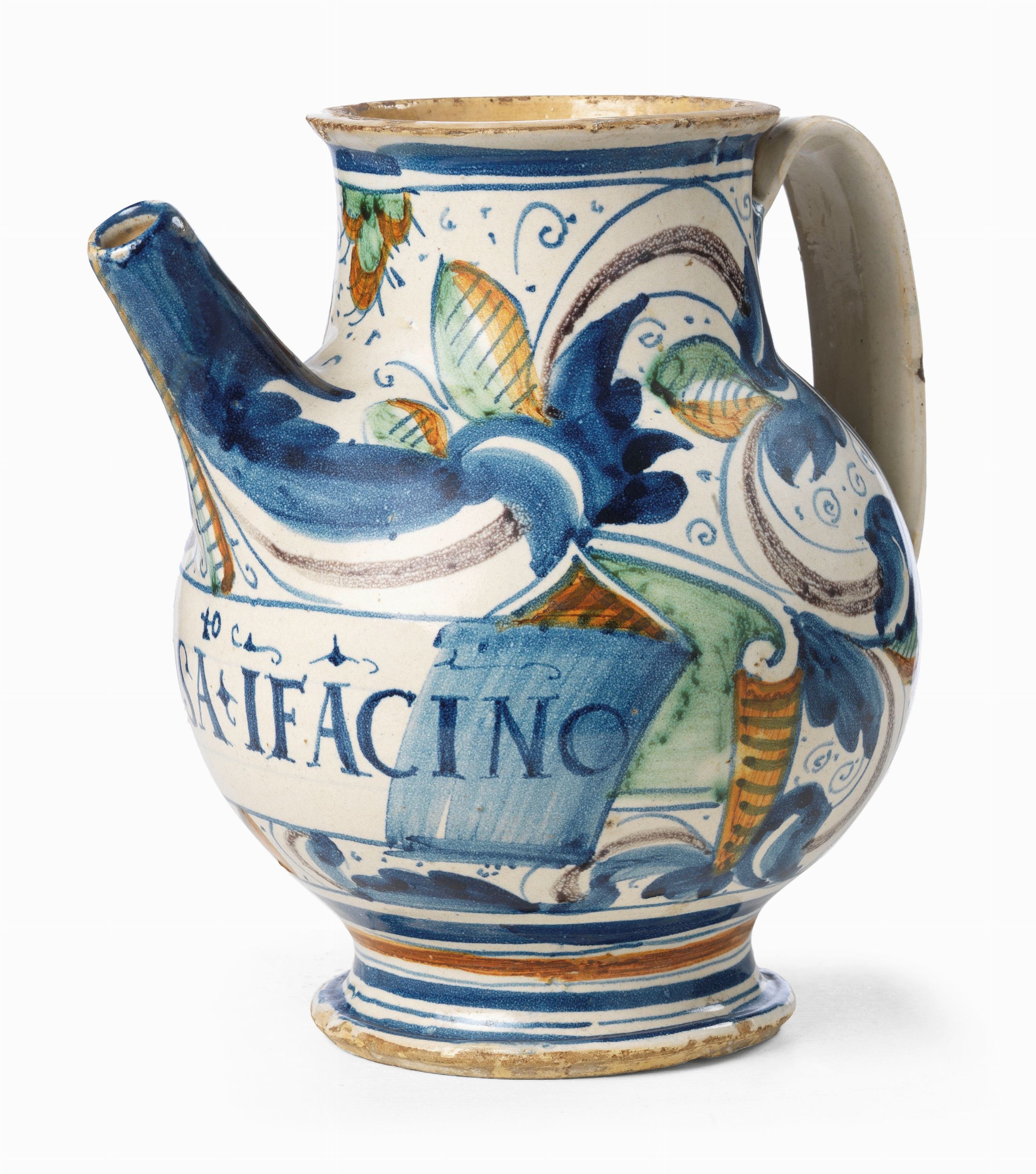 Orciolo in maiolica policroma bianco, blu, verde e ocra