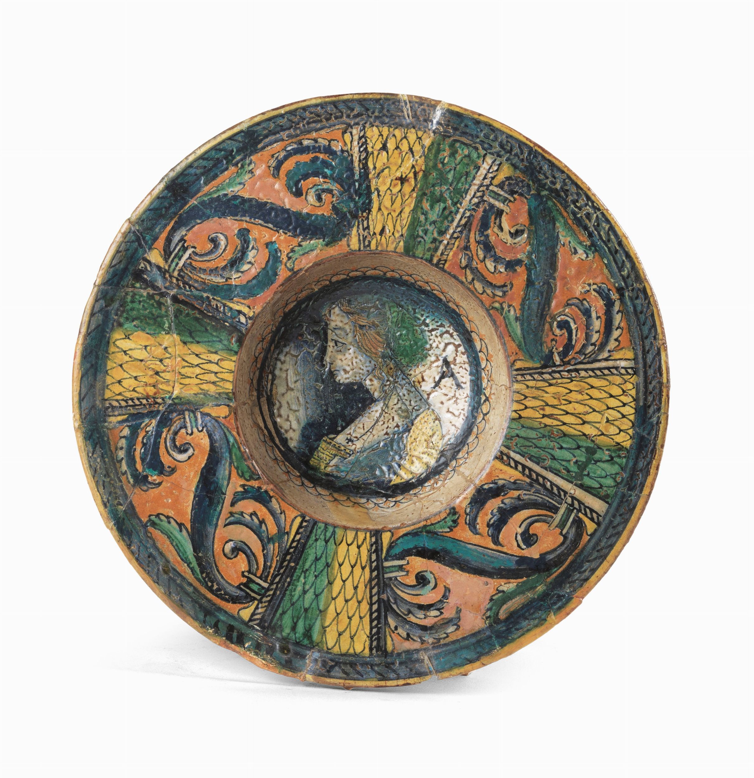 Piatto fondo in maiolica policroma verde, ocra e azzurro