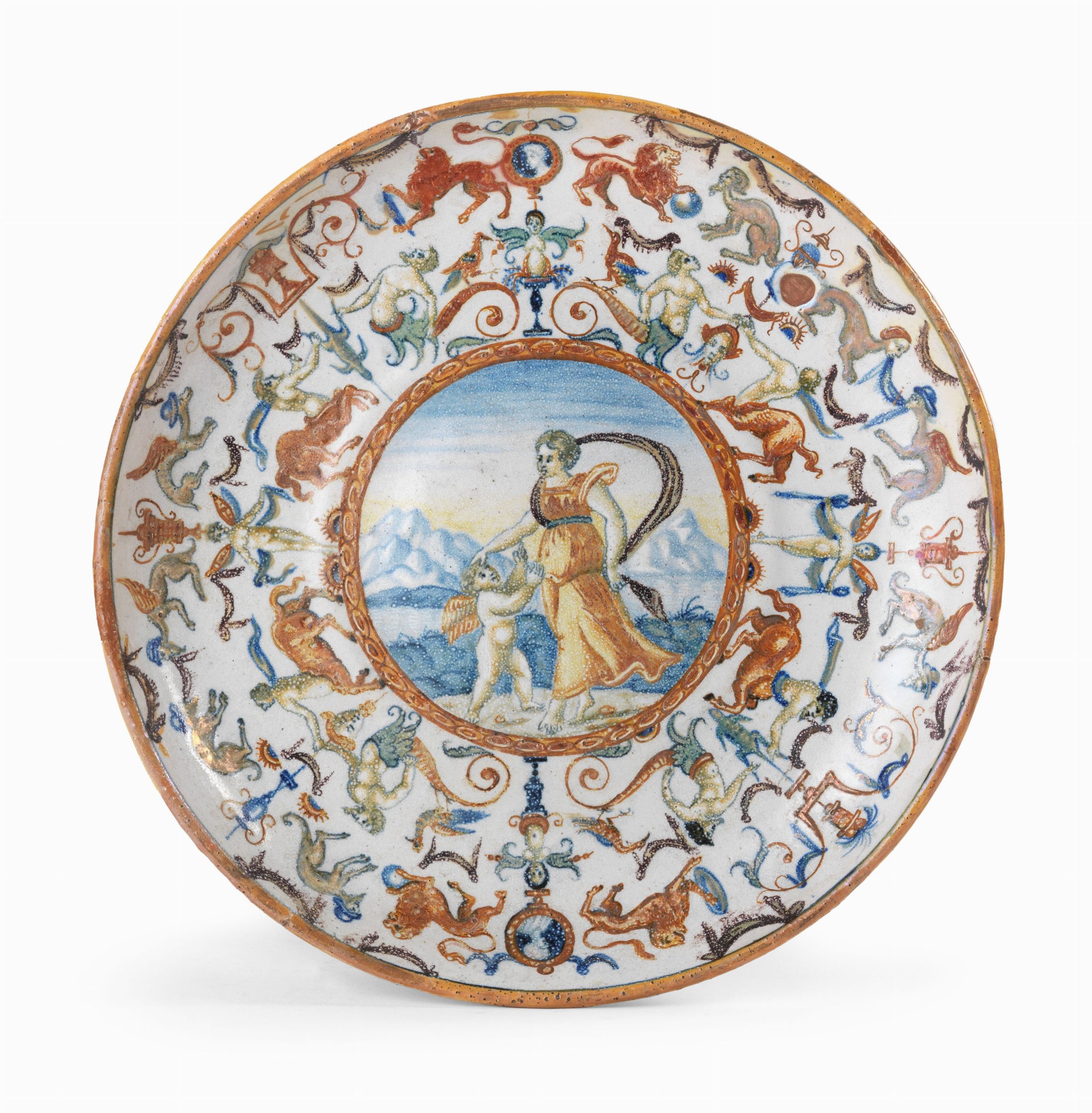 Piatto istoriato in maiolica policroma