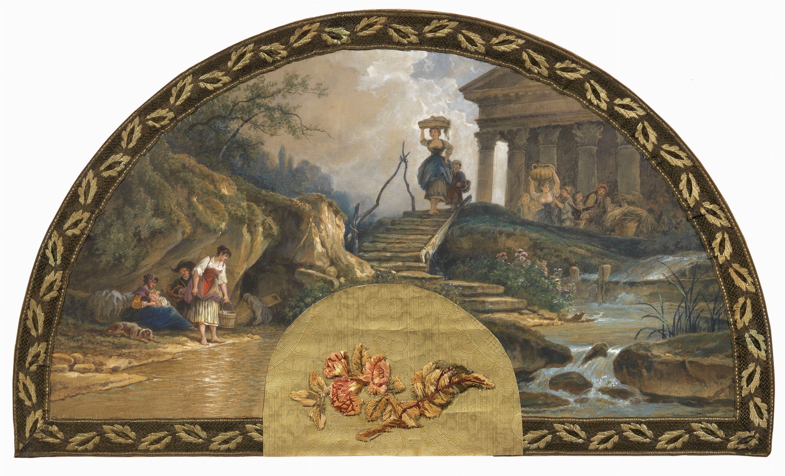 Tempera su carta a forma di ventaglio applicata su stoffa con ricami, cm. 36x69