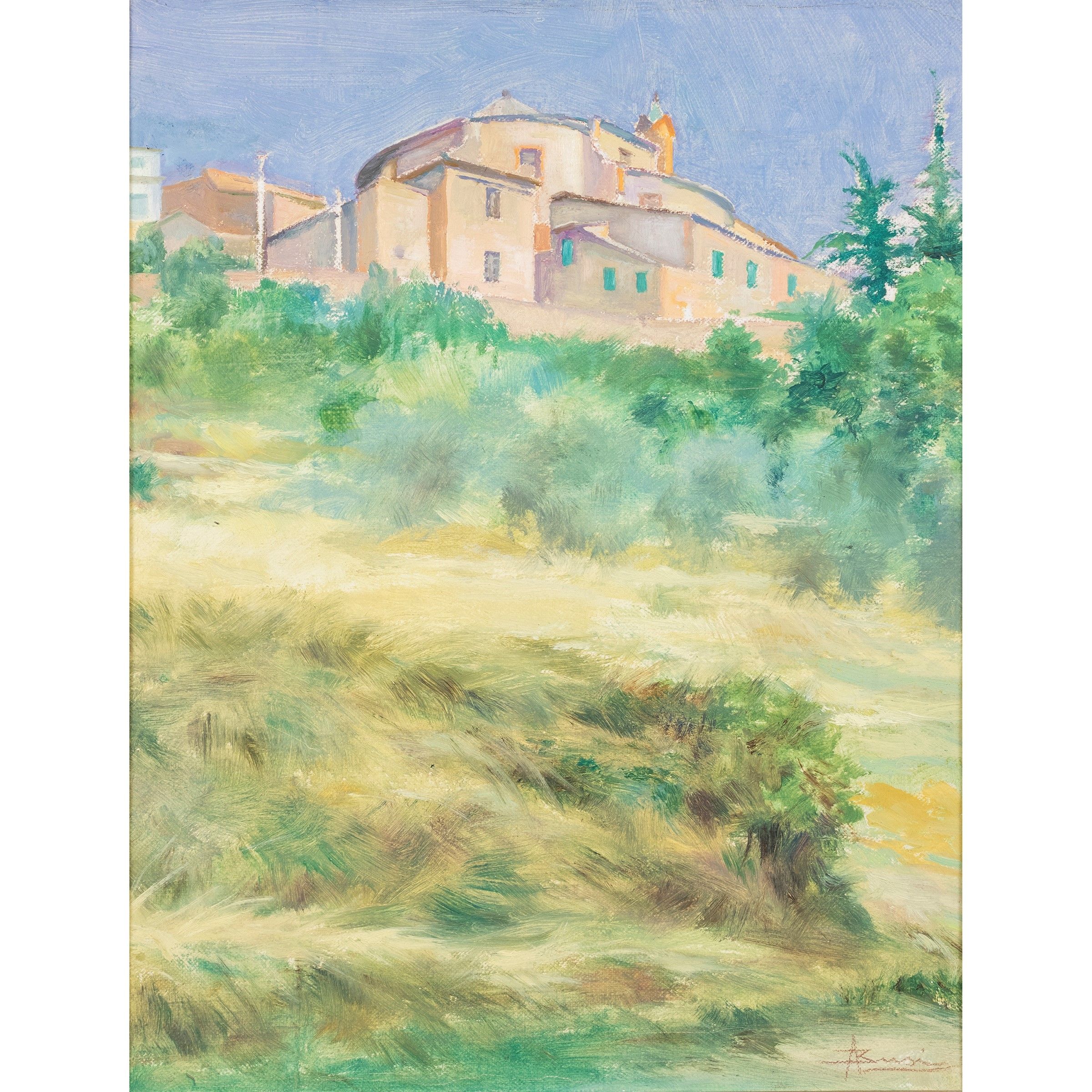Faenza 1891 - Bologna 1977 Scorcio di paese, olio su tela, firmato in basso a destra, entro cornice