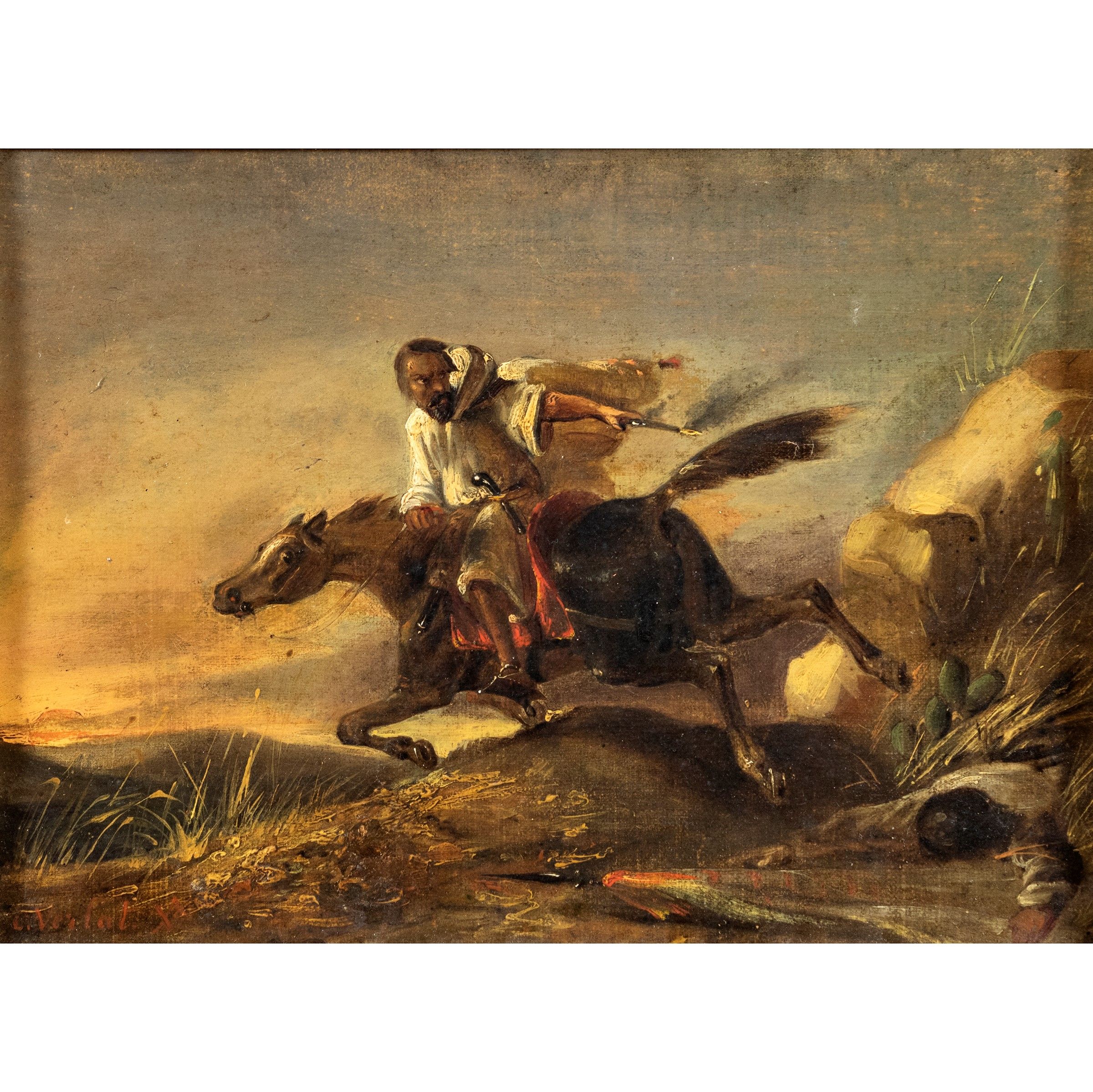 XIX Sec. Arabo a cavallo, olio su tela, firmato in basso a sinistra, entro cornice