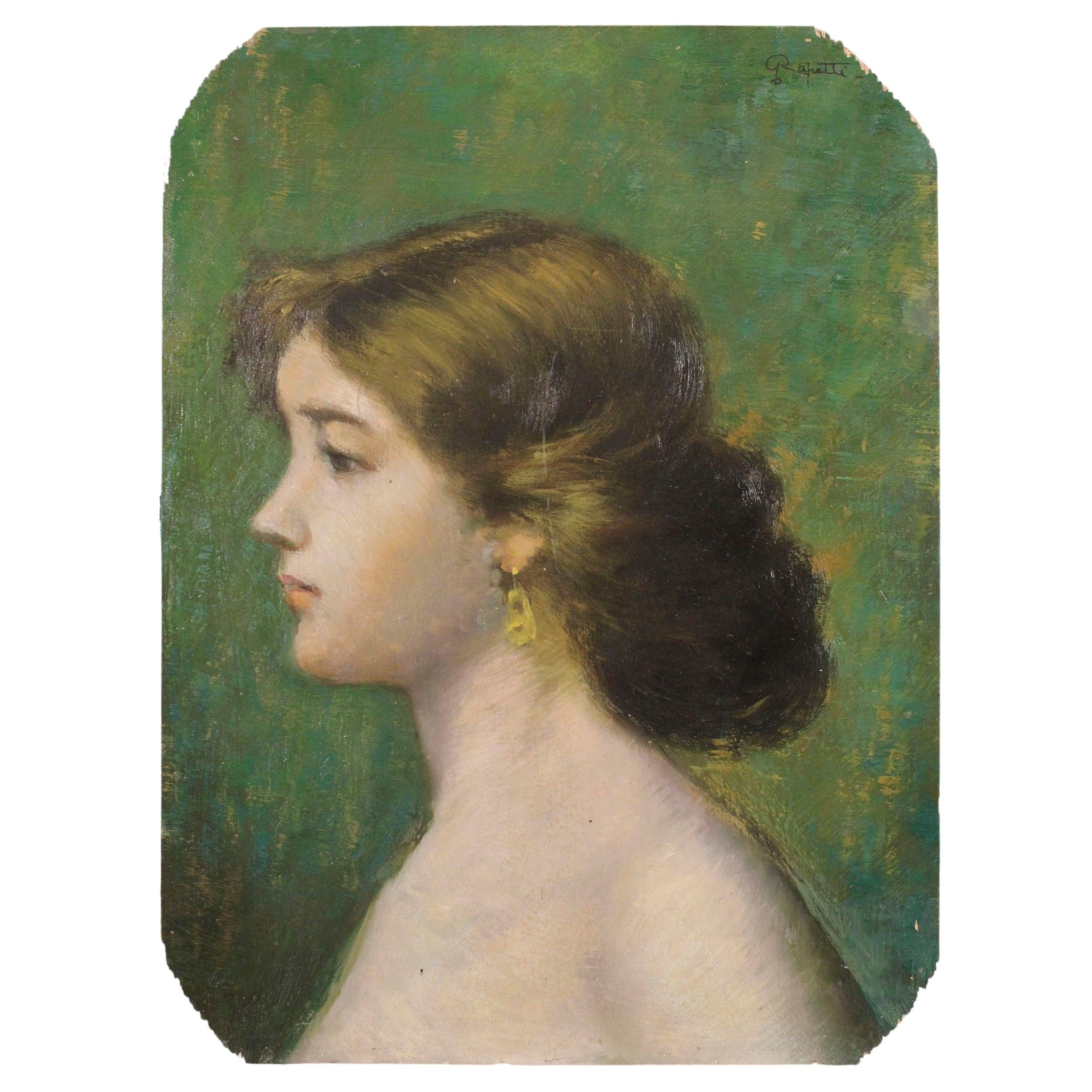 Milano 1859 - 1929 Profilo femminile, olio su compensato, firmato in alto a destra, entro cornice