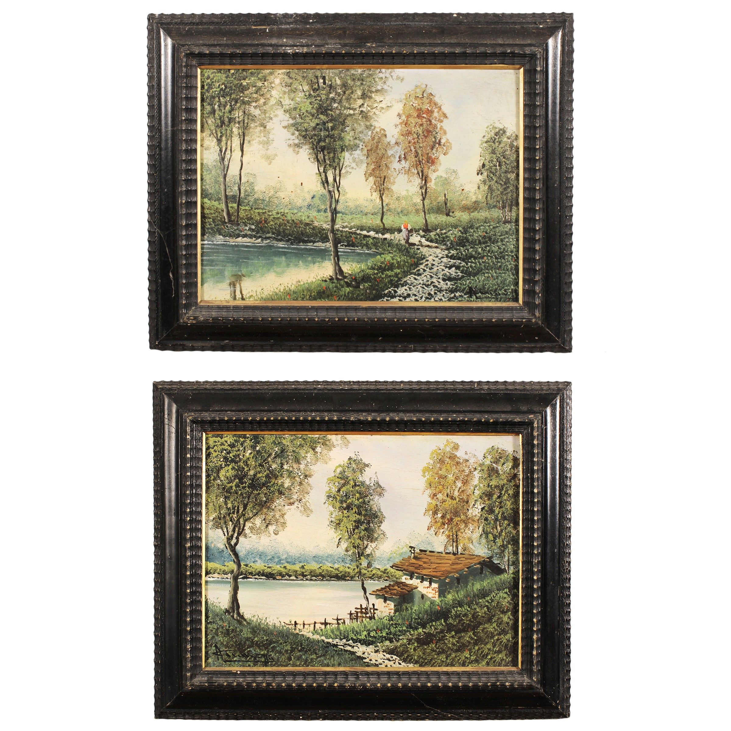Italia, XX Sec. Paesaggi lacustri, coppia di olii su tavola, firmati in basso a sinistra e a destra, entro cornici