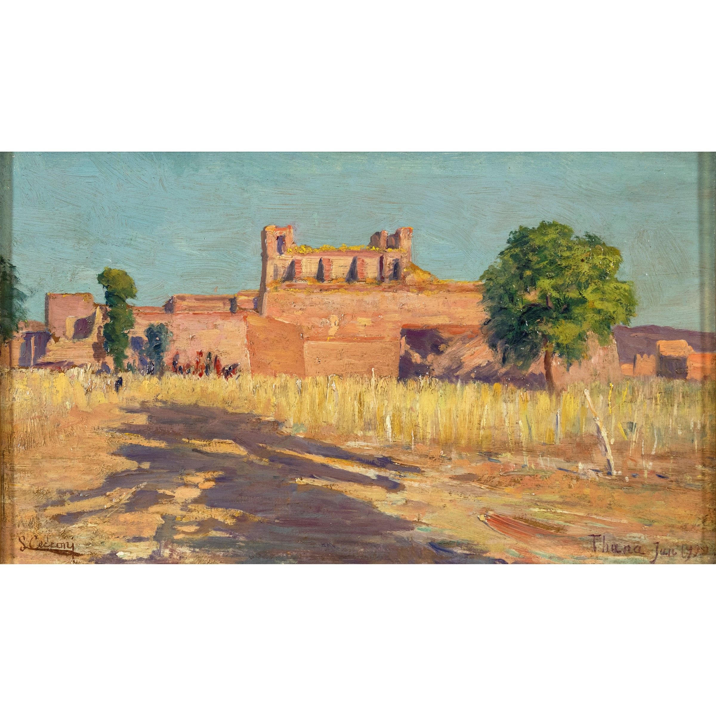 Roma 1863 - 1947 Thana Jun 1922, olio su tavola, firmato in basso a sinistra, titolo e data in basso a destra, entro cornice, sul retro reca frammento di cartiglio della seconda mostra internazionale arte coloniale 1934, Napoli