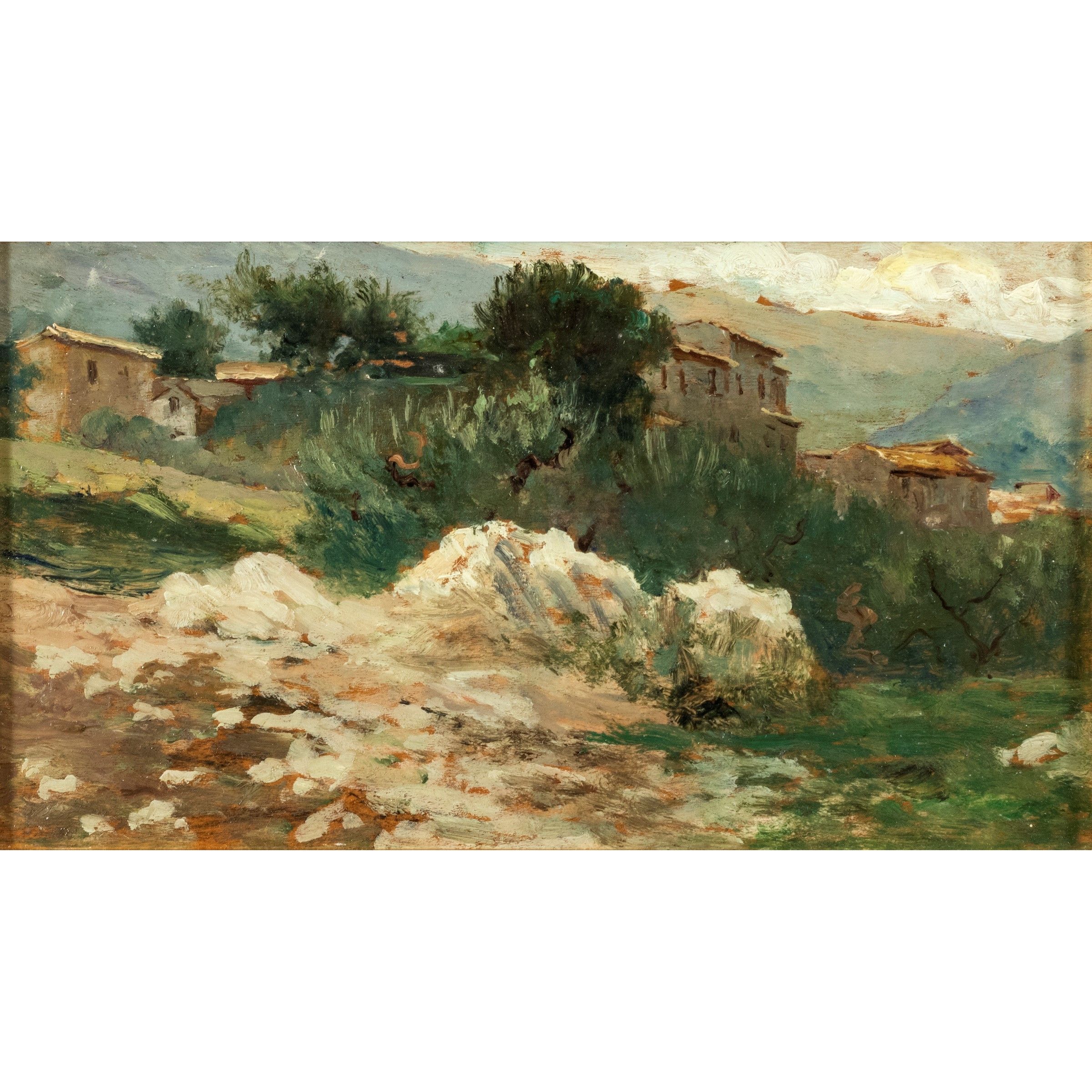 Roma 1863 - 1947 Paesaggio olio su tavola, firmato in basso destra, entro cornice