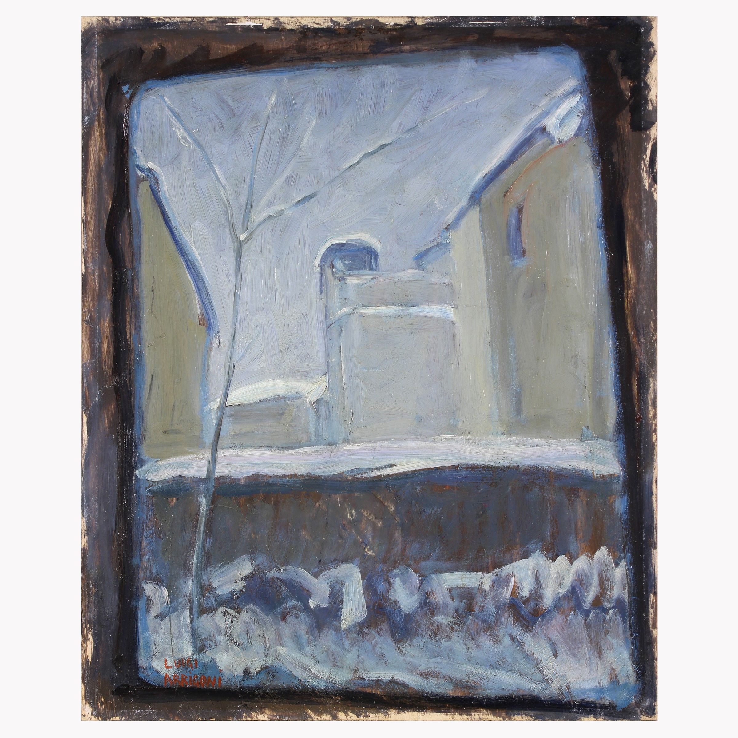 Piacenza 1896 - 1964 Scorcio innevato, olio su compensato, firmato in basso a sinistra, entro cornice