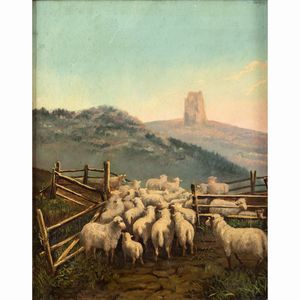 46x36 cm. Roma 1891 - 1967 Paesaggio con gregge, 1912, olio su tela, firmato e datato in basso a sinistra