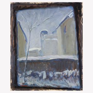 49,5x40,5 cm. Piacenza 1896 - 1964 Scorcio innevato, olio su compensato, firmato in basso a sinistra, entro c [..]