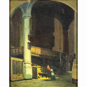 56x45 cm. Limbiate 1872 - Milano 1931 Interno di chiesa, 1926, olio su cartone, firmato e datato in basso a sinistra, [..]