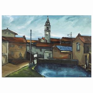 50x40 cm. Faenza 1891 - Bologna 1977 Scorcio di paese, olio su tela, firmato in basso a destra, entro cornice