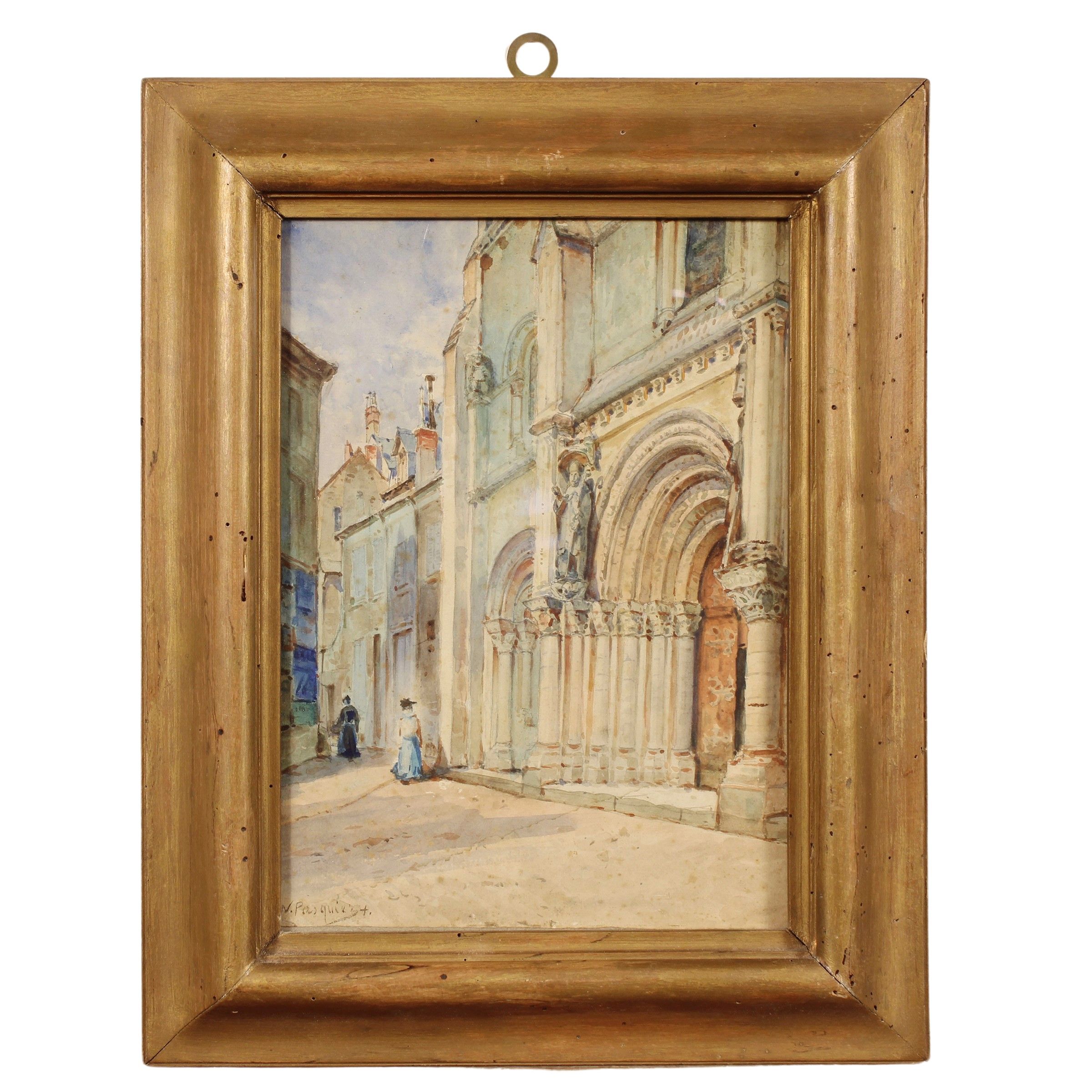 XIX Sec. Scorcio di chiesa, acquarello su carta, firmato N. Pasquier in basso a sinistra, entro cornice