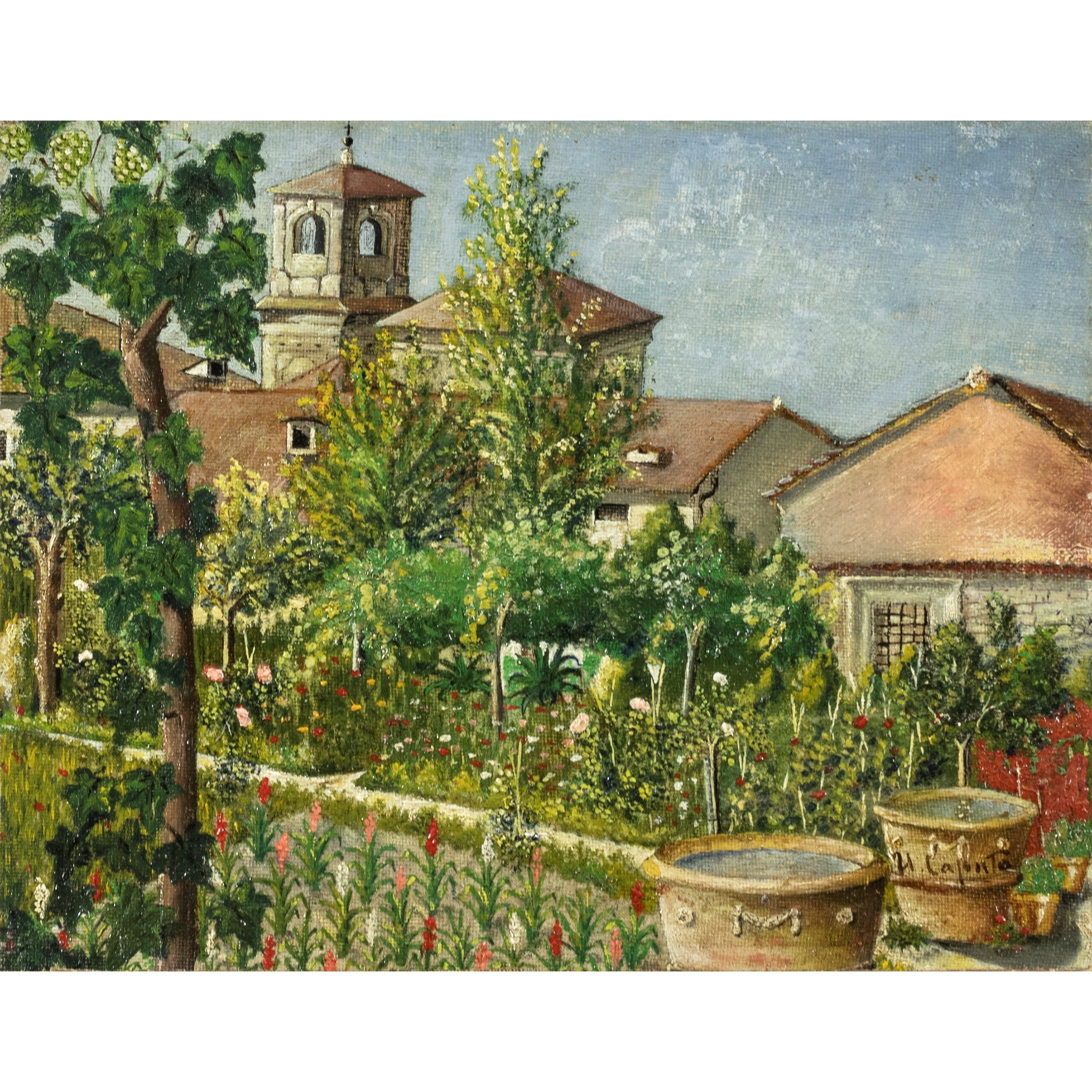 Salerno 1872 - Parigi 1948 Scorcio con campanile, olio su tela, firmato in basso a destra, entro cornice