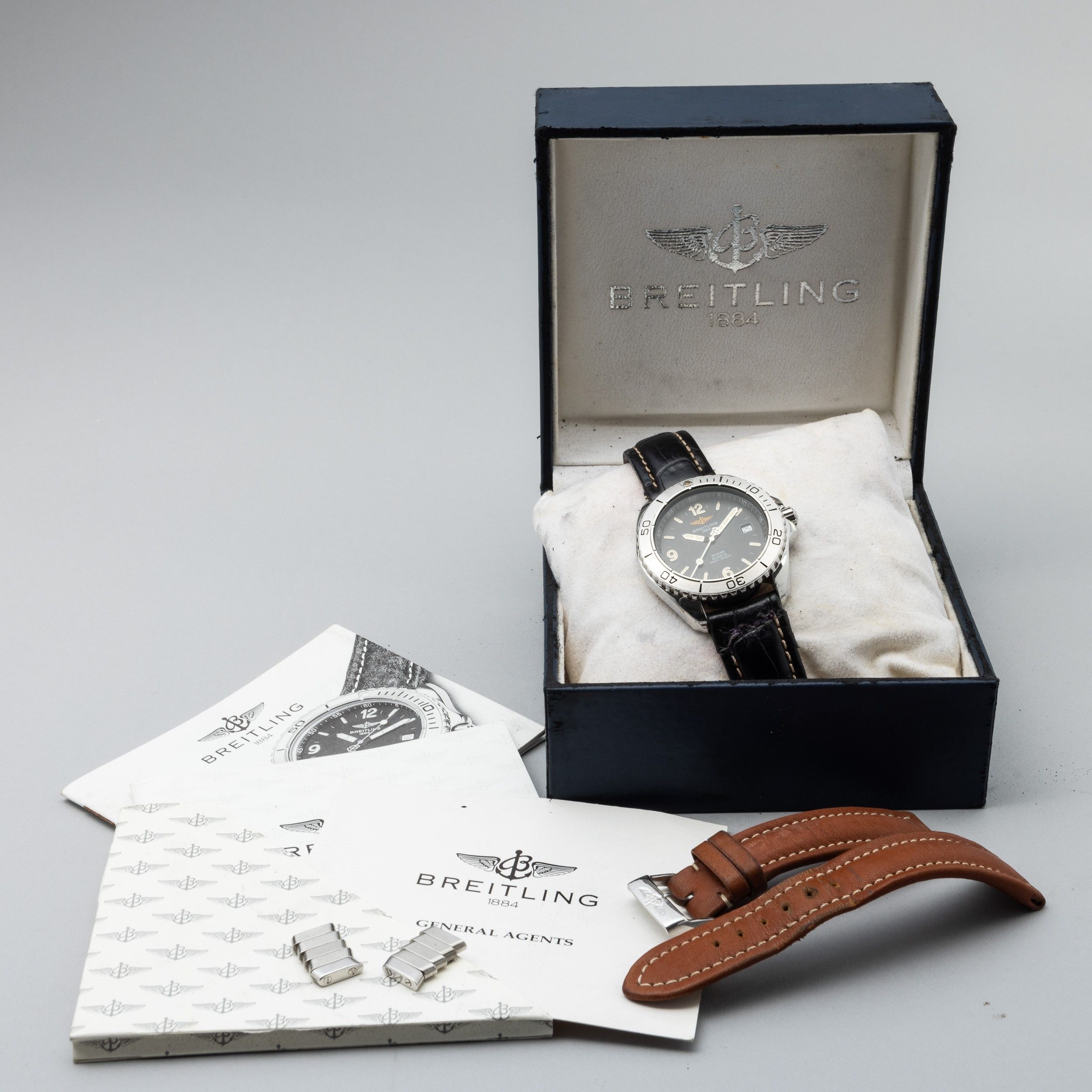 Breitling Shark in acciaio quadrante antracite indici a bastone, numeri arabi e datario, ref a5860512b146, cassa n° 1437, movimento automatico, cinturino in pelle, 40 mm, 1993 circa, scatola e garanzia doppio cinturino