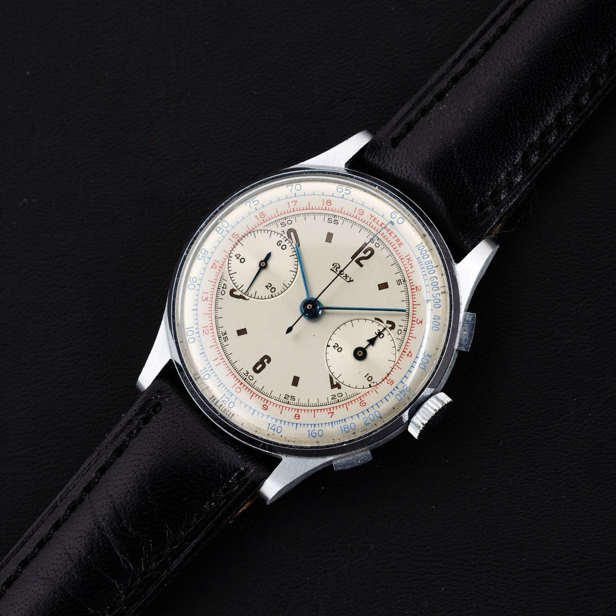 Cronografo due contatori tasti quadri carica manuale, quadrante argentè con scale [..]