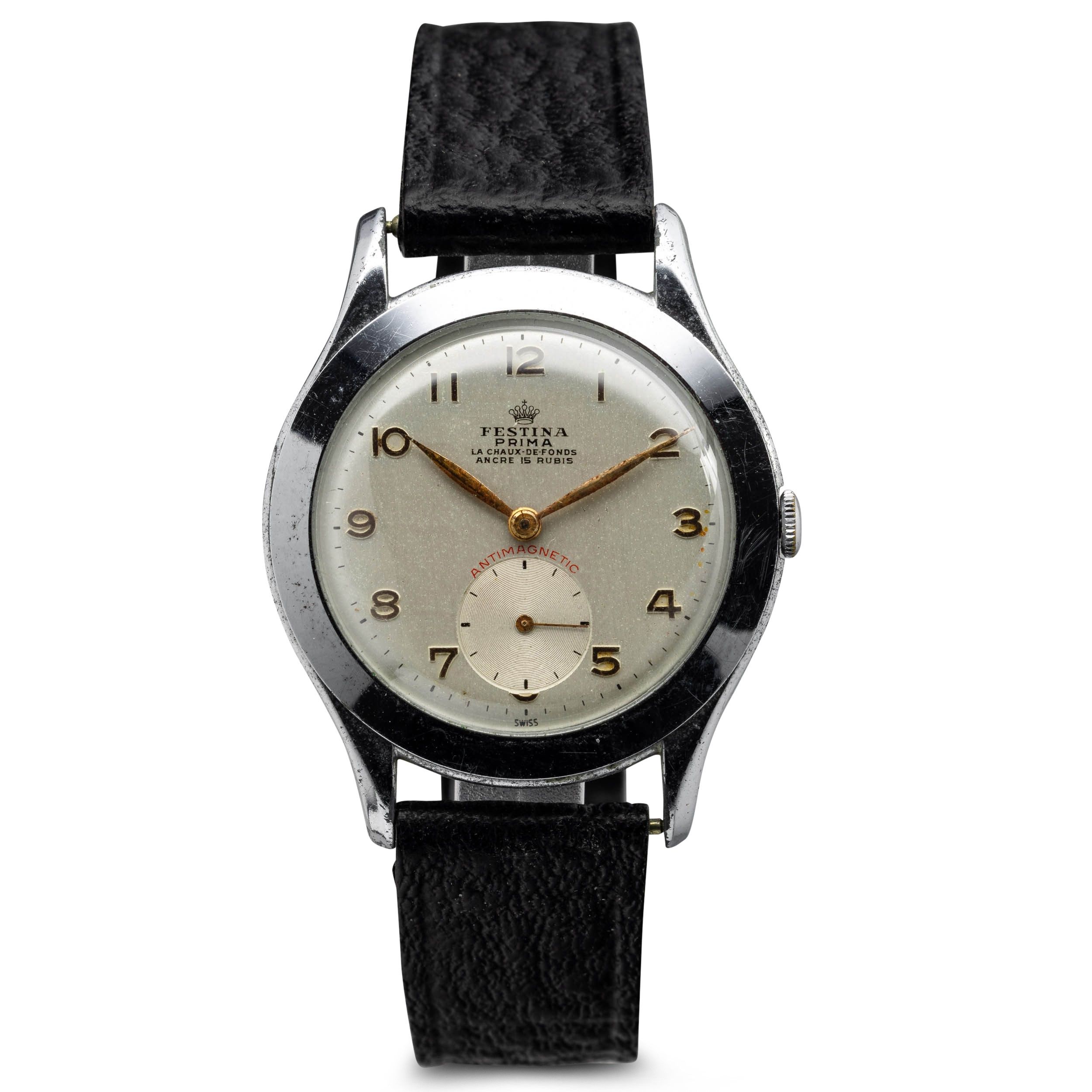 Festina in acciaio con quadrante color avorio e secondi al sei, carica manuale, numeri arabi applicati, cinturino in pelle, 34 mm, 1950 circa
